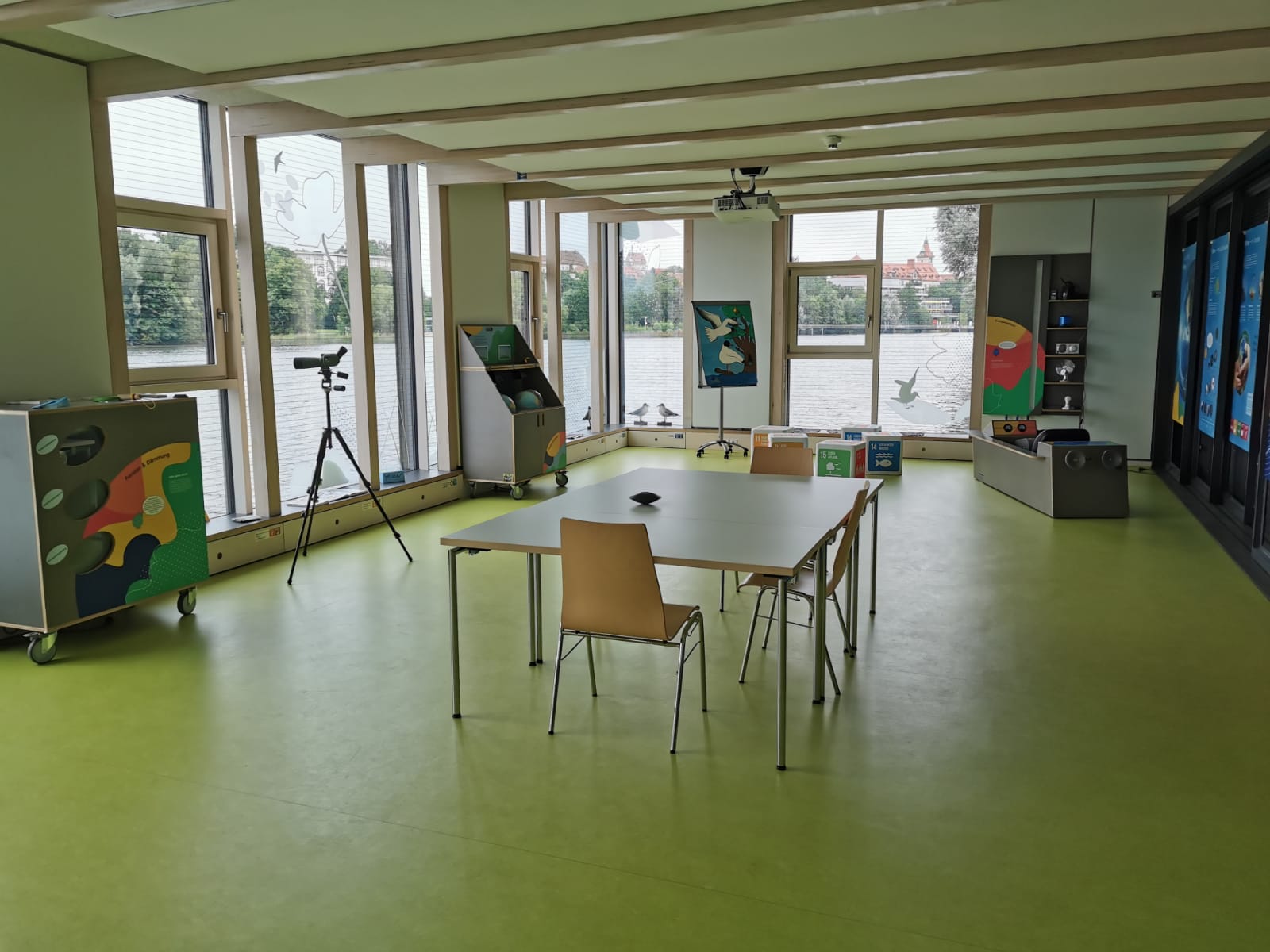 Direkt neben dem Seminarraum befindet sich eine kleine Küche, die auch für Veranstaltungen genutzt wird. Zudem hat die Energie- und Umweltstation einen großen Außenbereich: Hier können Vögel beobachtet und vergrößerte Wassertierchen genau betrachtet werden.