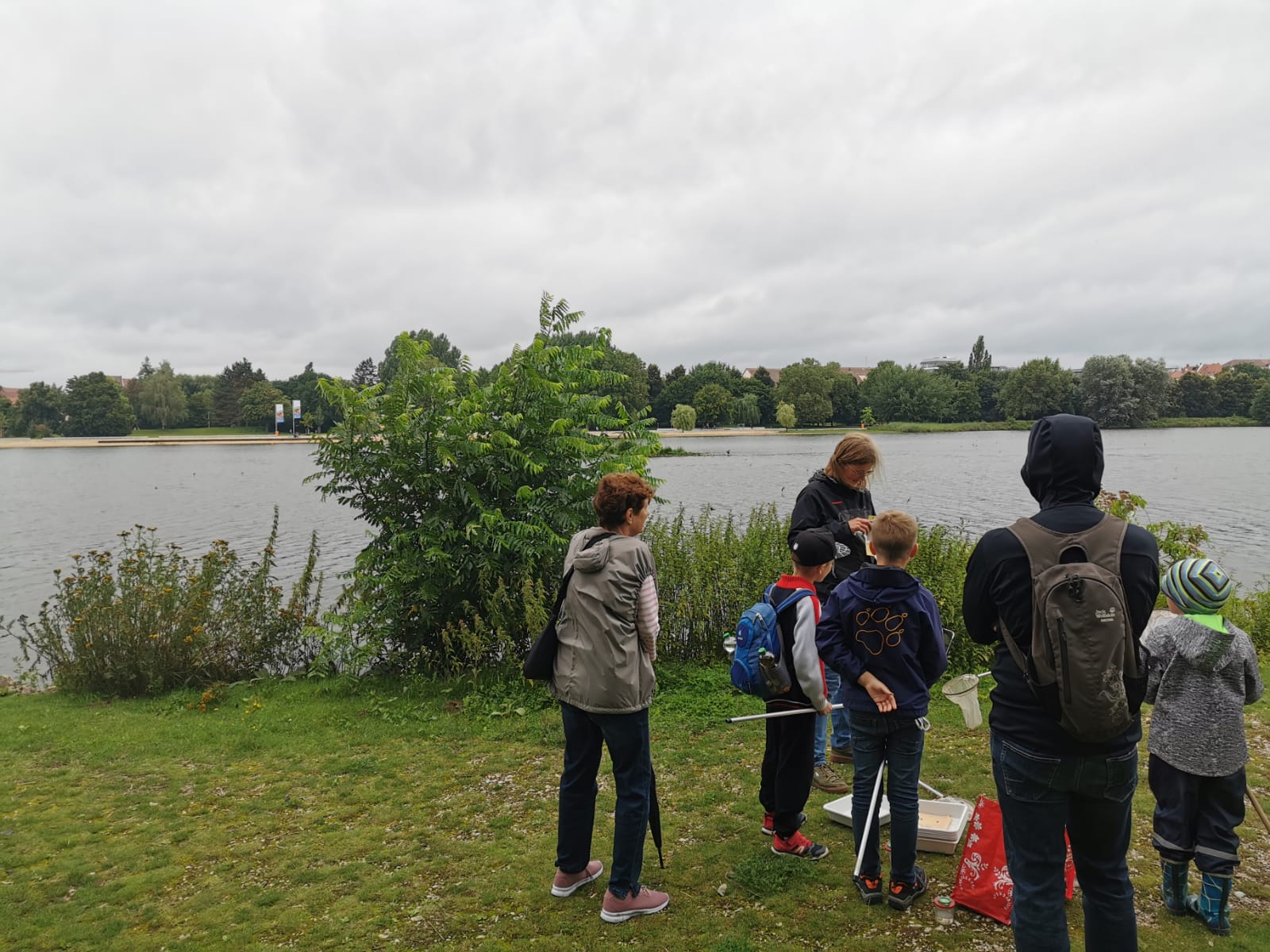 Nachdem nun das Erzeugen von Strom und das Speichern von Energie nachvollzogen, Blässhuhnküken beobachtet und viele Fragen gestellt wurden, geht es ausgestattet mit Keschern und Becherlupen an den Wöhrder See. Dort findet eine kurze Einführung durch eine Mitarbeiterin der Energie- und Umweltstation statt, in der es darum geht, welche Insekten es in diesem Gewässer gibt und woran sie zu erkennen sind.