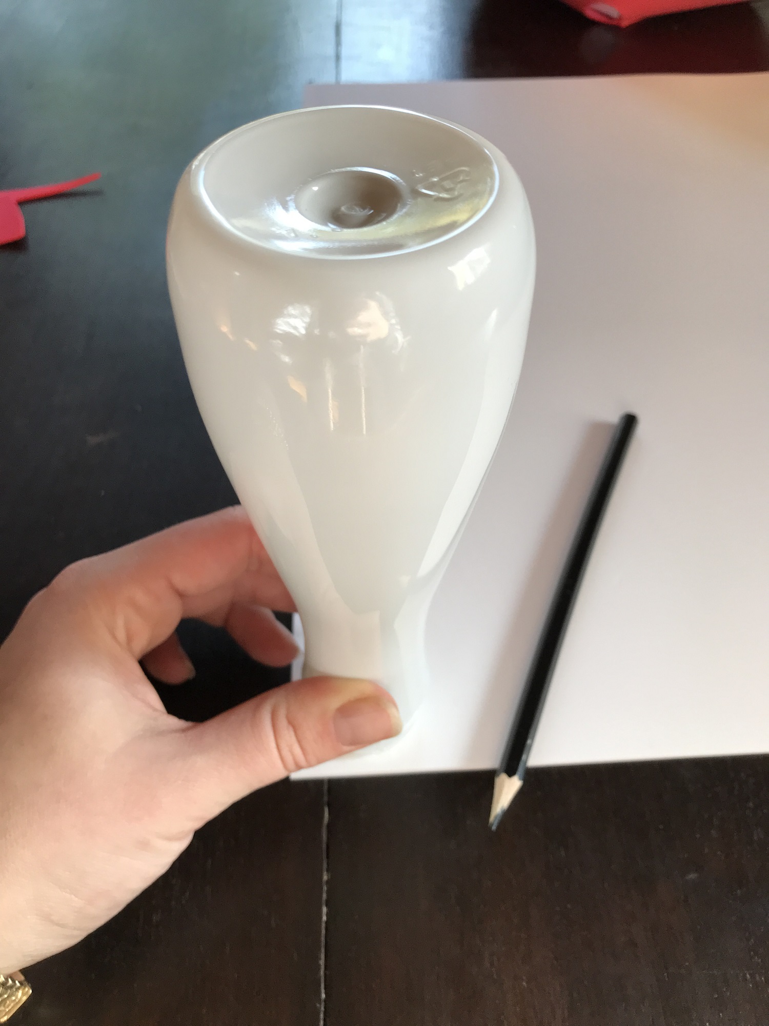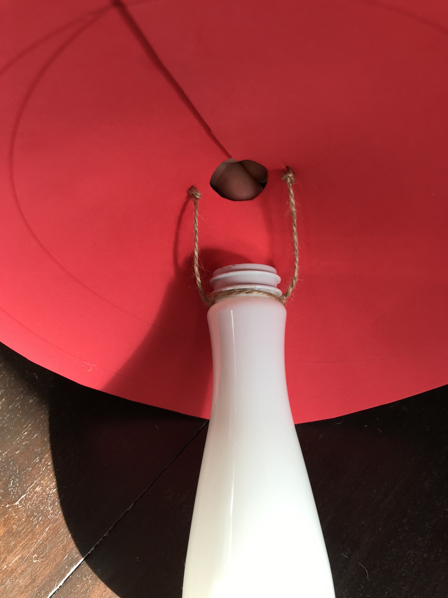 Nun legt ihr die große rote Scheibe auf den Tisch und zeichnet euch mit Hilfe der Flasche einen Kreis in die Mitte. Dreht die Flasche einfach auf den Kopf und zeichnet einmal um die Öffnung rum. Diesen Kreis schneidet ihr aus, indem ihr vom Rand einmal bis in die Mitte schneidet. Seht euch am besten die folgenden 2 Bilder an: