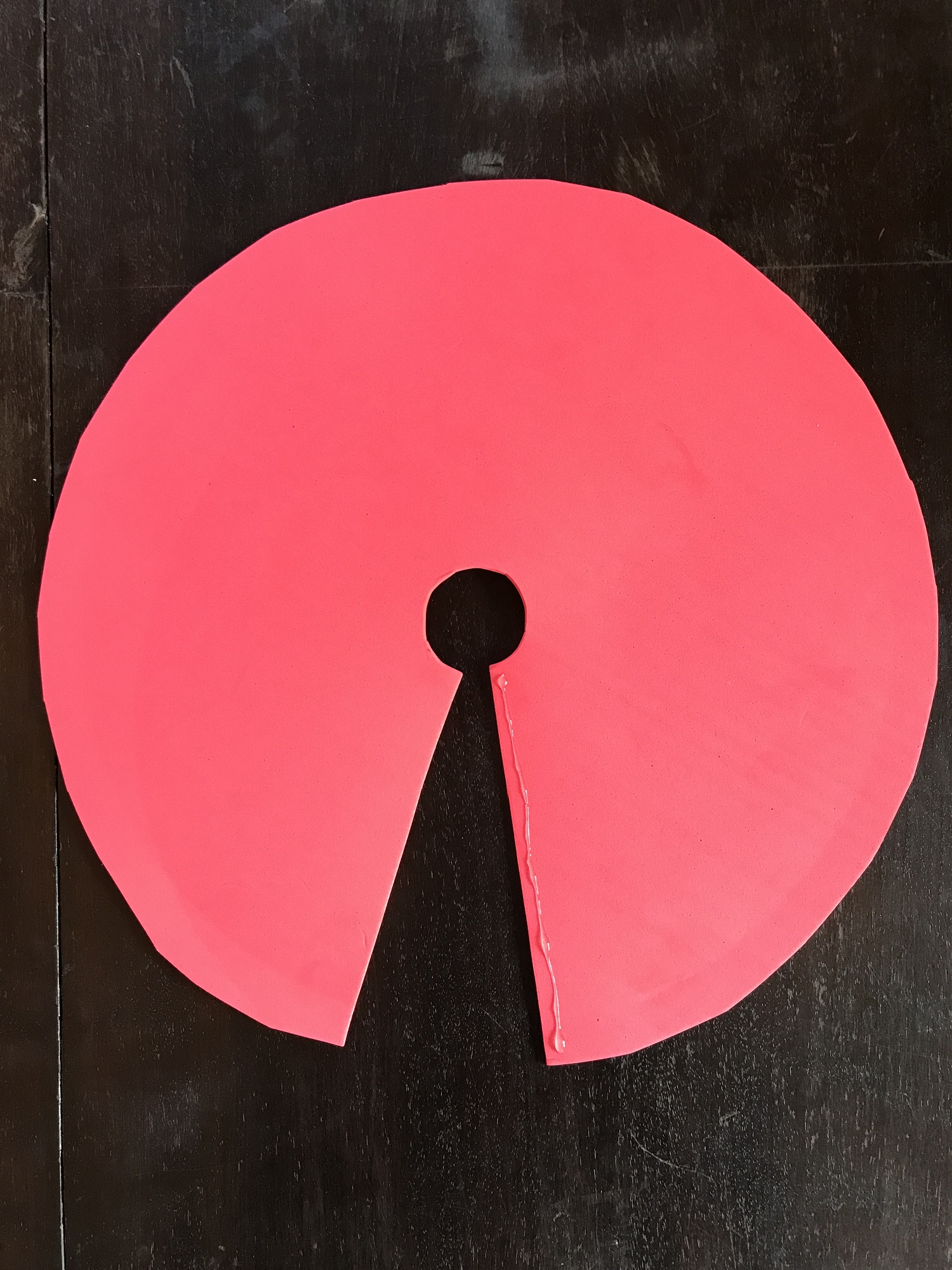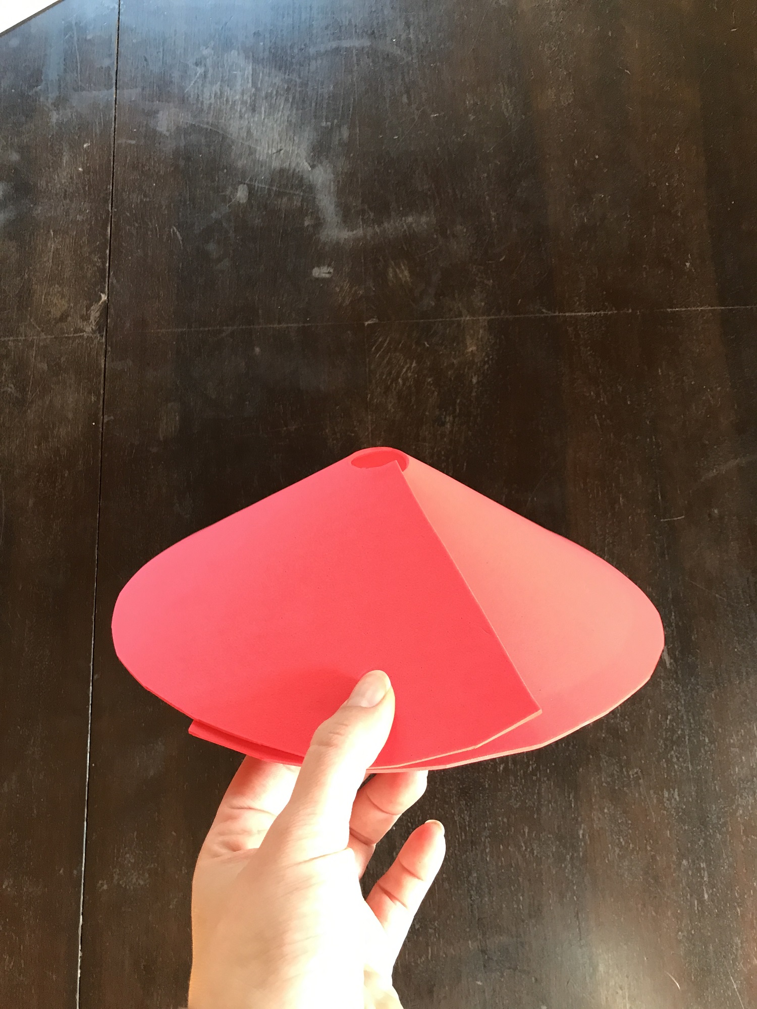 Jetzt könnt ihr die rote Scheibe nehmen und die zwei aufgeschnittenen Seiten einmal übereinander legen. Dann seht ihr, wie der Pilzhut aussehen wird. Je nachdem wie Spitz der Kopf zulaufen soll, schiebt ihr die zwei Seiten übereinander. Wenn es euch passt wie der Pilzhut aussehen wird dann könnt ihr es entweder direkt verkleben und das überschüssige Moosgummi im Nachhinein abschneiden, oder ihr schneidet vorher ein Stück weg und verklebt die zwei Seiten im Anschluss. Hierbei ist etwas Feingefühl gefragt, drückt die zwei Seiten gut fest und wartet ein paar Minuten, bevor ihr wieder loslasst. So kann der Kleber gut antrocknen.