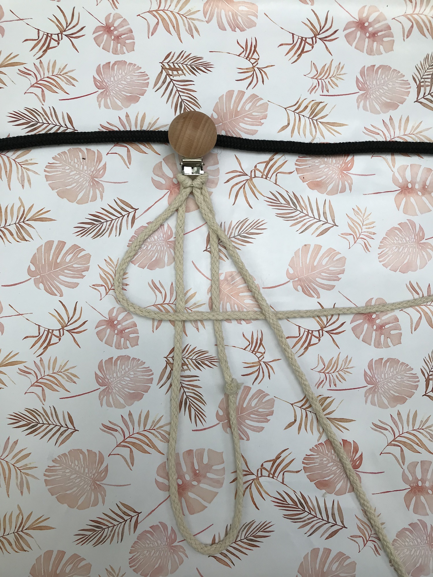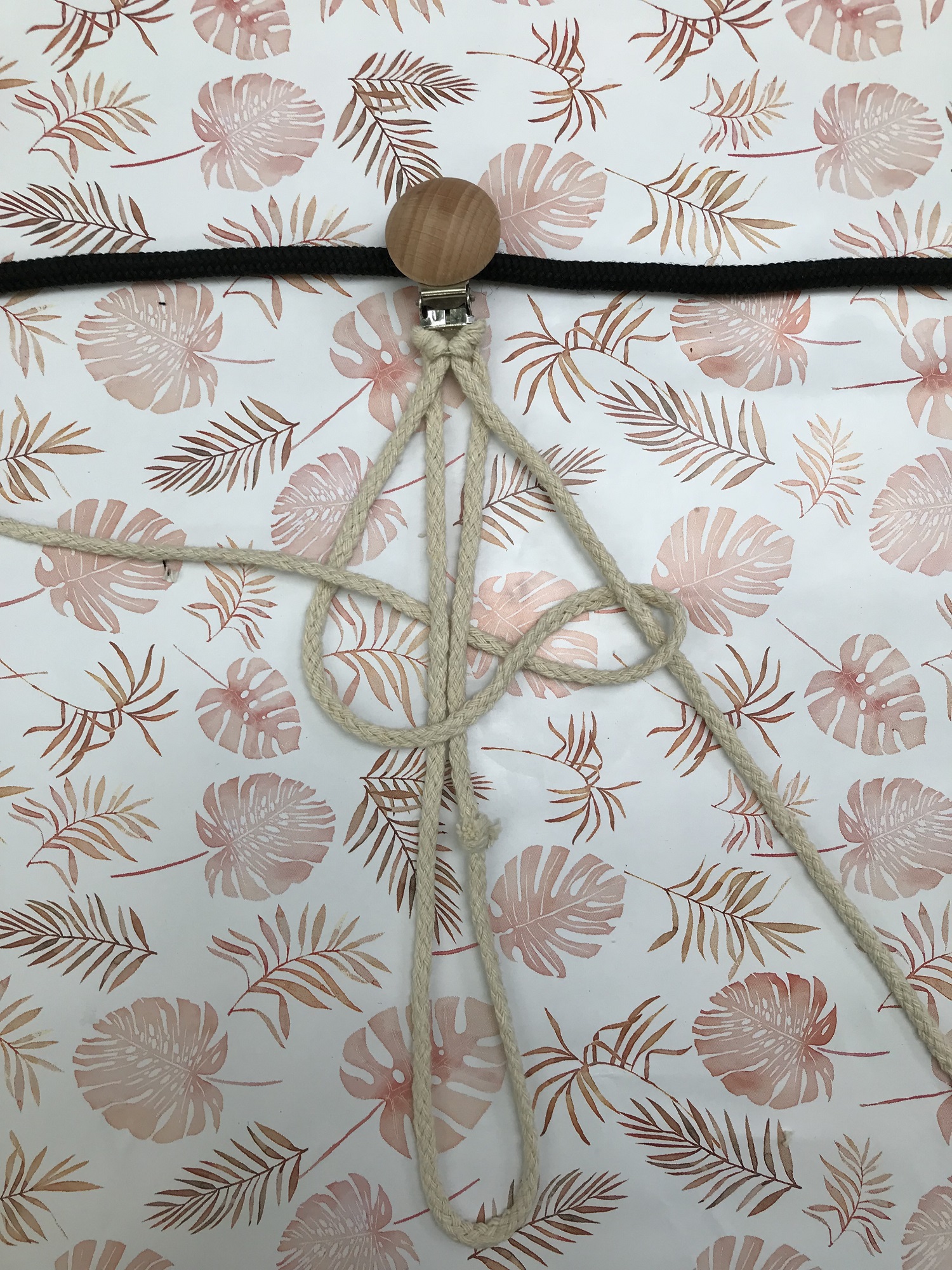Im nächsten Schritt beginnen wir, die Garne mit einer Makramee-Technik miteinander zu verknüpfen. Wie Ihr seht, bleibt die Schlaufe immer in der Mitte liegen – und mit den längeren Garnen wird die Schnullerkette geknüpft.
