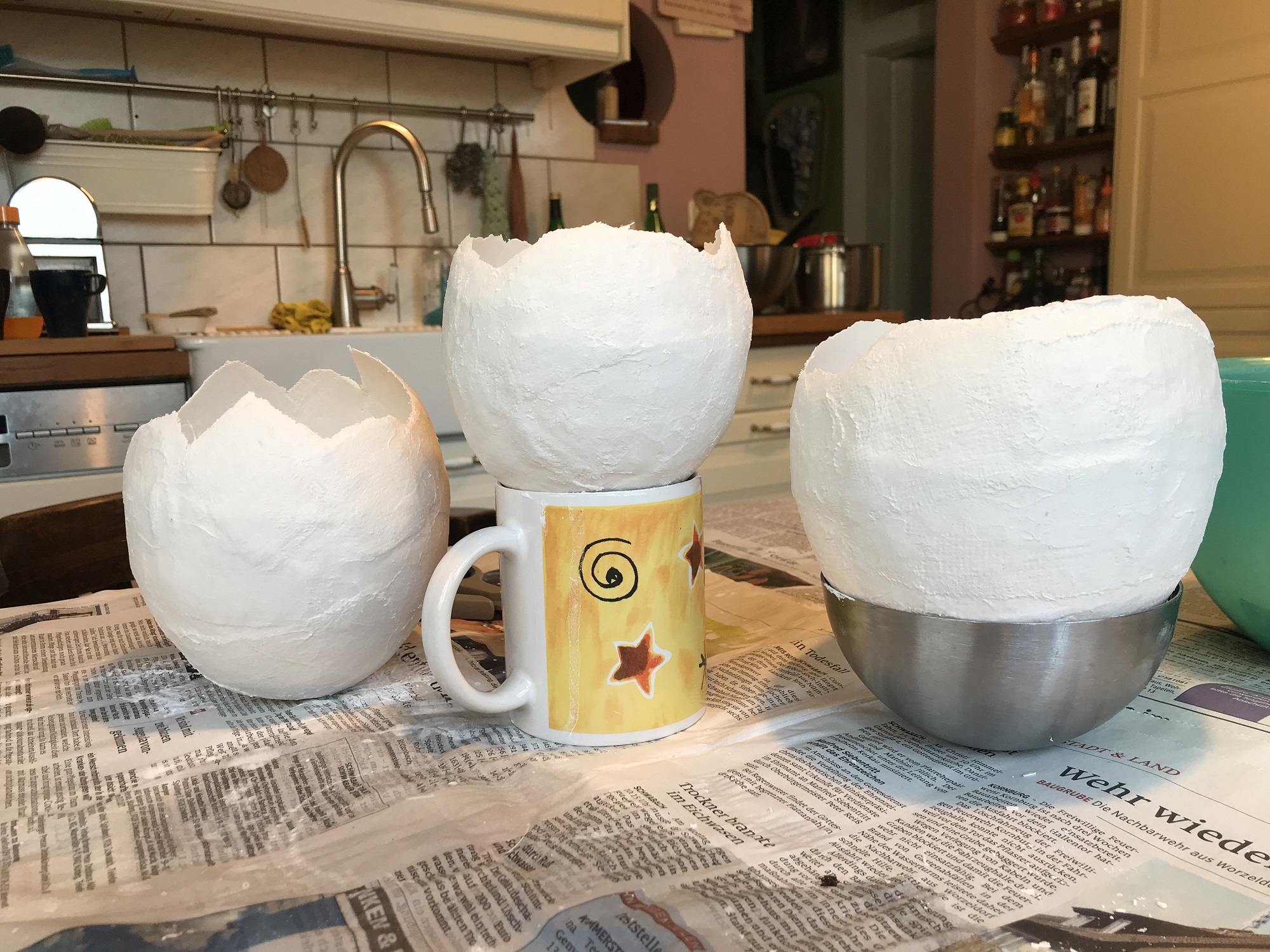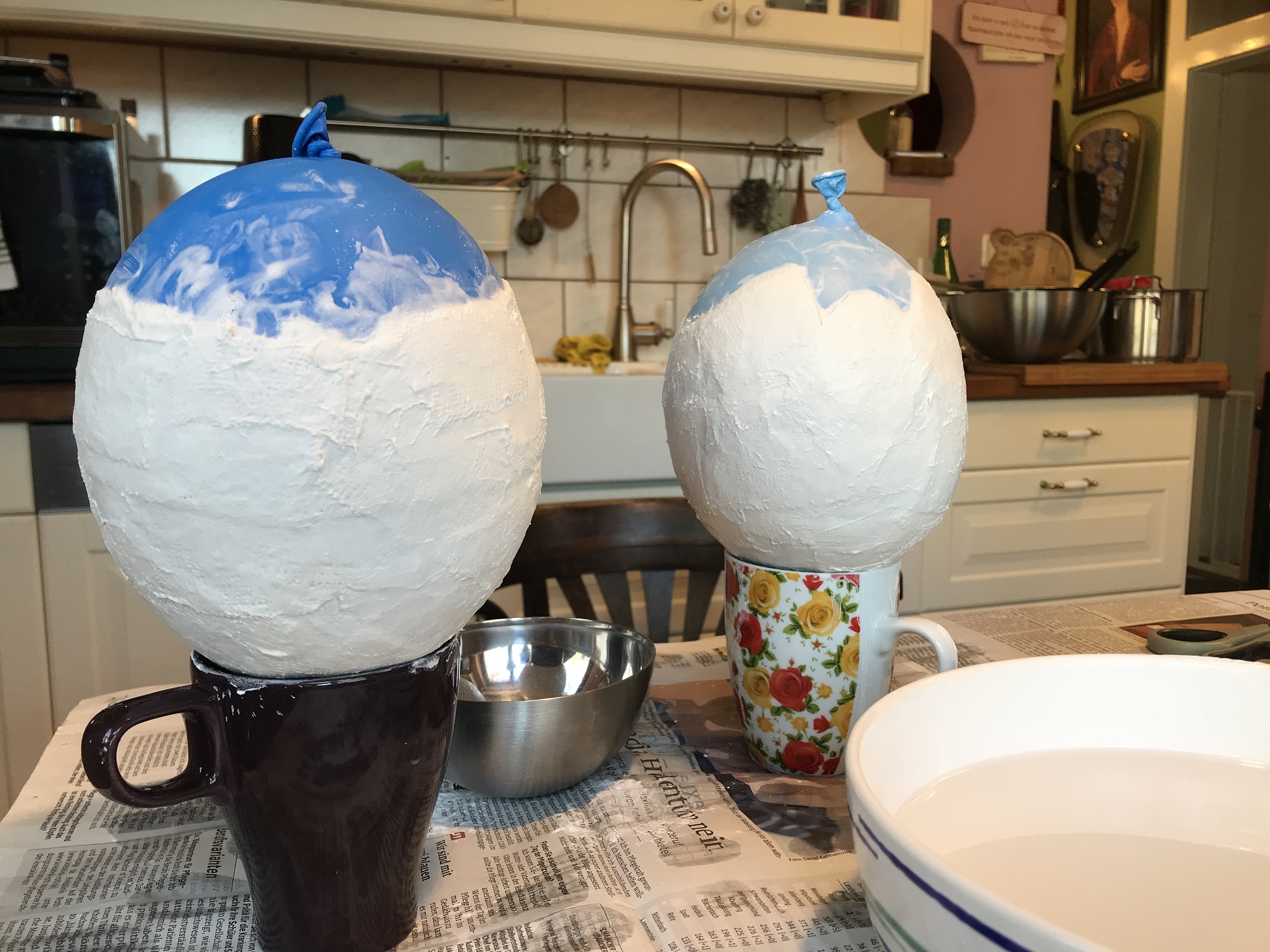 Legt euren Luftballon mit dem Knoten nach unten auf die Tasse. Jetzt könnt ihr beginnen, den Gips um den Luftballon herum zu arbeiten.