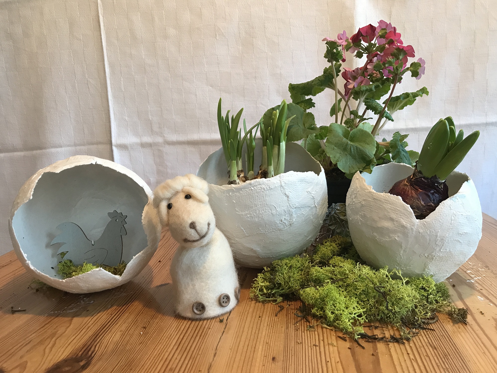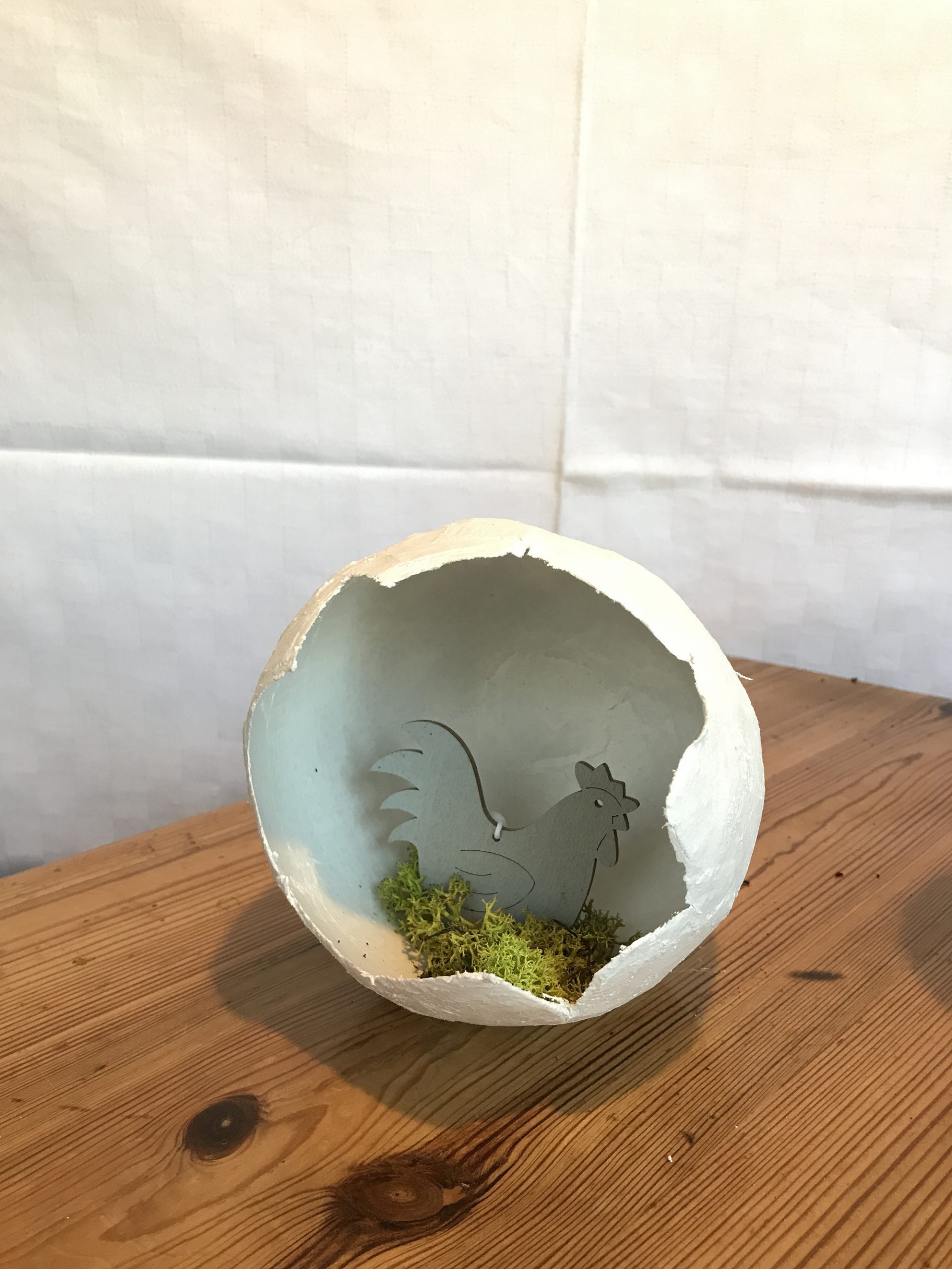 Eine schöne Idee ist es auch, das Osterei zu legen und innen zu dekorieren, zum Beispiel mit etwas Moos und einer lustigen Hühner-Figur.