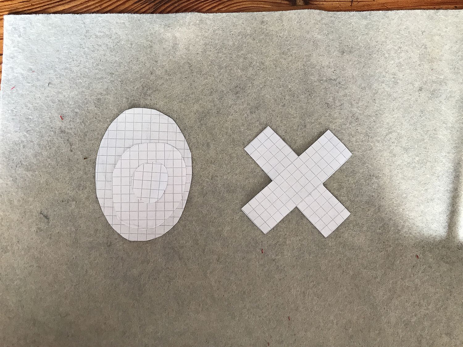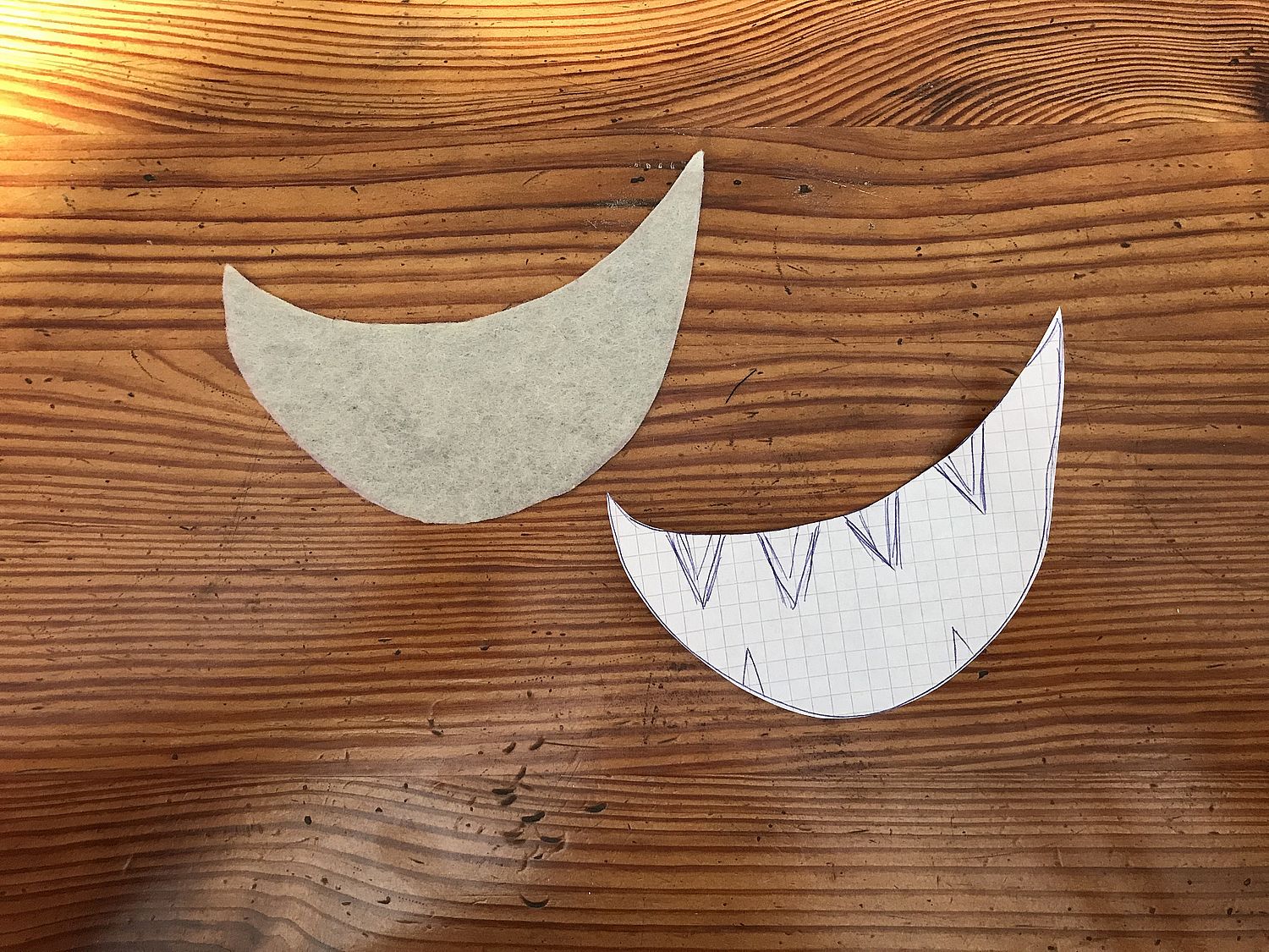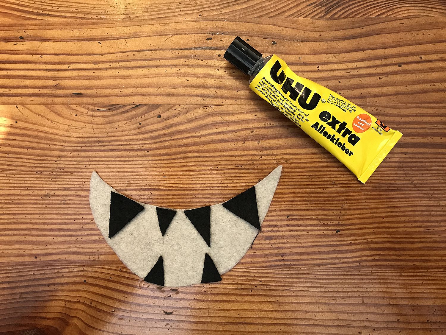Mit dem Mund und den Zähnen verfahren wir ganz genauso. Wir machen uns eine Vorlage auf Papier, die wir dann auf die Filzplatten übertragen und ausschneiden. Die Zähne werden mit einem Alleskleber auf den Mund geklebt.