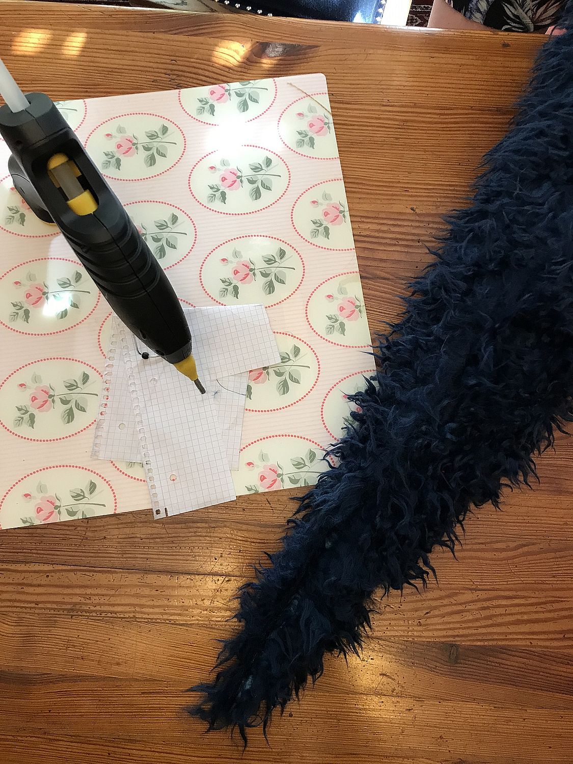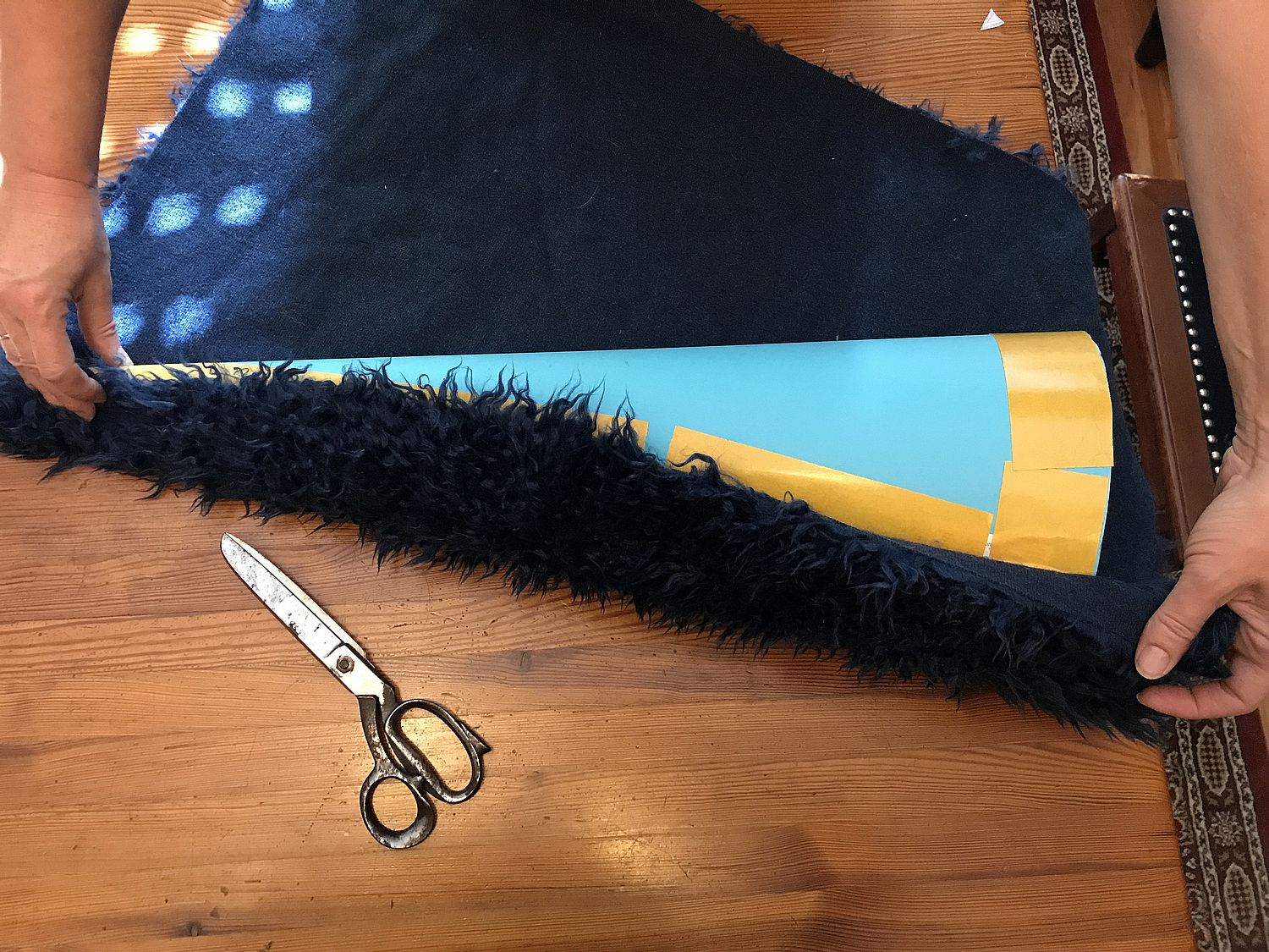 Nun geht es ans Eingemachte. Wir kleben unseren zotteligen Monsterstoff auf die Schultüte. Dafür klebt ihr das doppelseitige Klebeband einmal oben um die Öffnung rum. Zieht aber noch nicht die Folie ab! Das machen wir erst nach und nach während wir den Stoff aufkleben. Mit dem doppelseitigen Klebeband klebt ihr auch 2 Bahnen bis zur Spitze der Schultüte. Einmal vorne und einmal hinten. Auf einer Seite könnt ihr diese Folie nun abziehen, und auch einen Teil der Folie oben an der Öffnung abziehen. Jetzt fangt ihr an, rundherum den Stoff zu befestigen und gleichzeitig die Folie abzuziehen. Das ist etwas kniffelig, holt euch am besten noch jemanden, der oder die euch beim Halten behilflich sein kann.