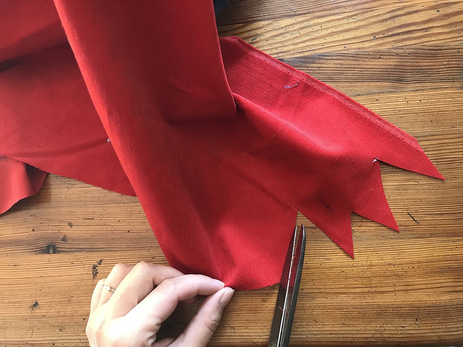 Wir sind fast fertig! Nun klebt ihr den Stoff zum Verschließen der Schultüte an die Innenseite der Öffnung, das macht ihr am besten auch mit doppelseitigem Klebeband, welches ihr von Innen an den Rand der Öffnung klebt. Drückt den Stoff gut an und schneidet ihn dann ungefähr bei einer Länge von 30cm ab. Nun könnt ihr nach Belieben kleine oder große Zacken einschneiden oder ihr franzt den Stoff aus.
