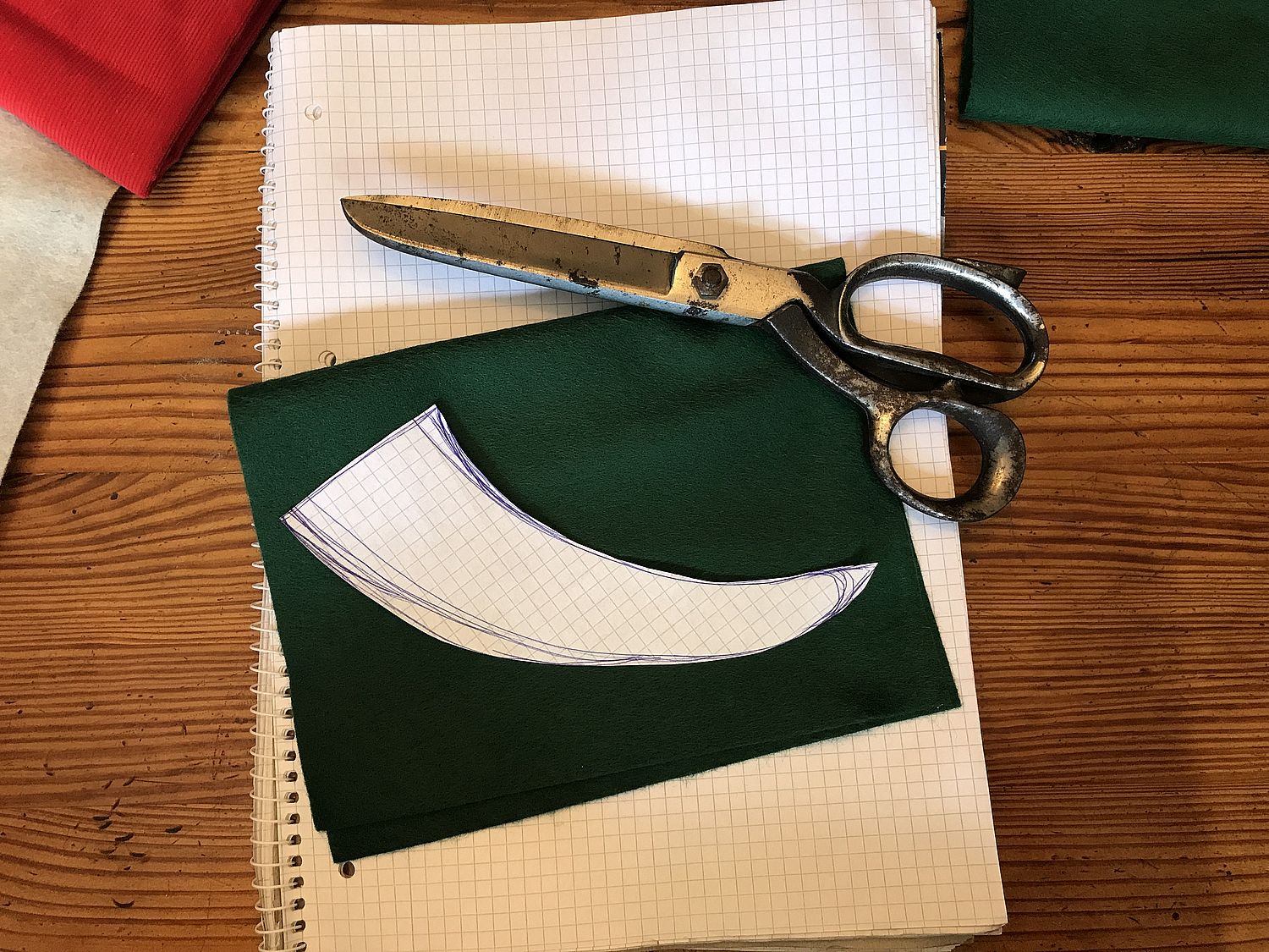 Malt euch nun auf den Block eine Vorlage für ein Horn. Das könnt ihr auf dem Papier ausbessern solange bis es euch gefällt. Wenn ihr denkt, dass das Horn so richtig ist, schneidet ihr das Papier aus und legt das Horn auf eine 1-mal gefaltete Filzplatte. Nun könnt ihr alles zusammenhalten und vorsichtig am Rand der Papiervorlage schneiden. Dann habt ihr zwei genau gleich große Hörner aus der Filzplatte ausgeschnitten. Für das zweite Horn nehmt ihr die aller gleiche Papiervorlage und schneidet mit deren Hilfe die andere, gefaltete Filzplatte. Nun habt ihr 4 Teile aus denen 2 Hörner genäht werden.