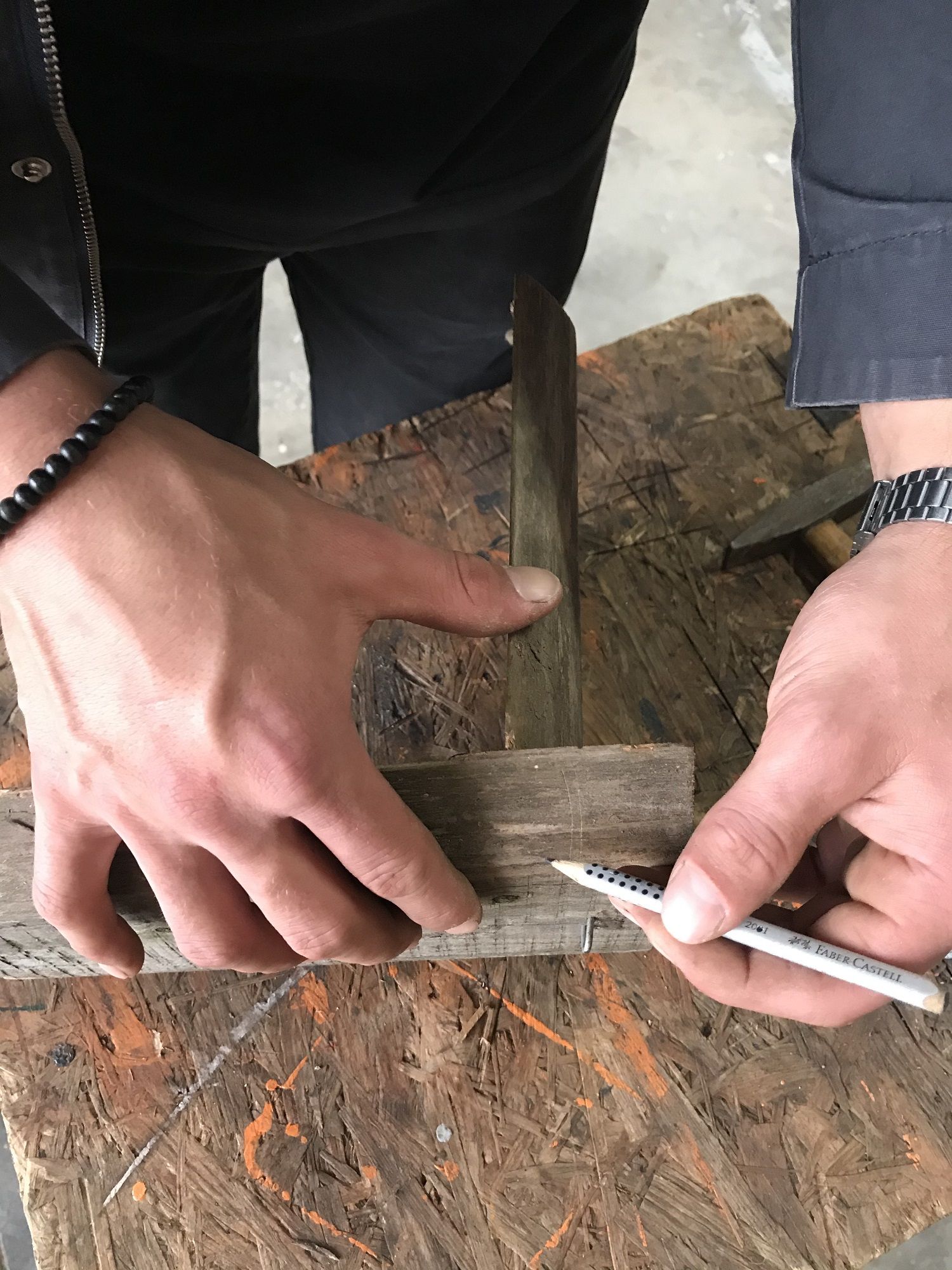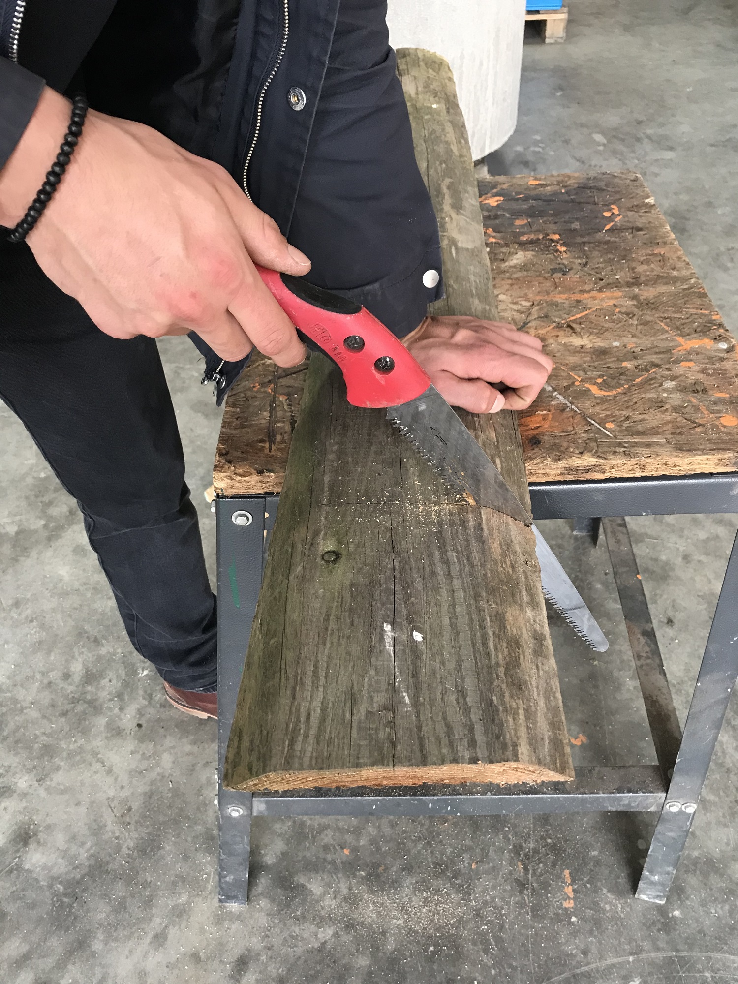 Nun halten wir die Holzlatte mit einer Hand stabil auf der Werkbank fest und sägen an den zwei aufgezeichneten Strichen entlang.
