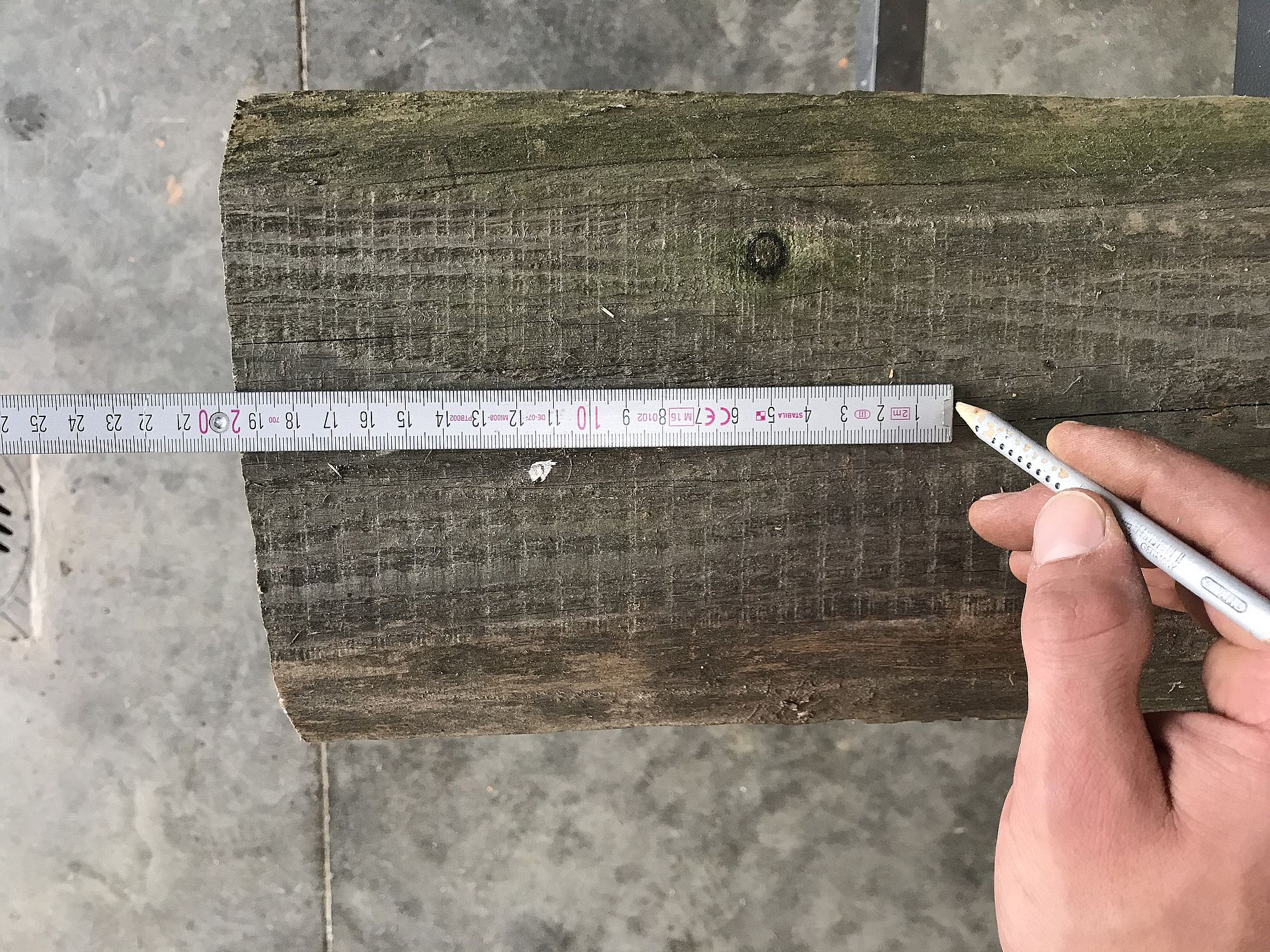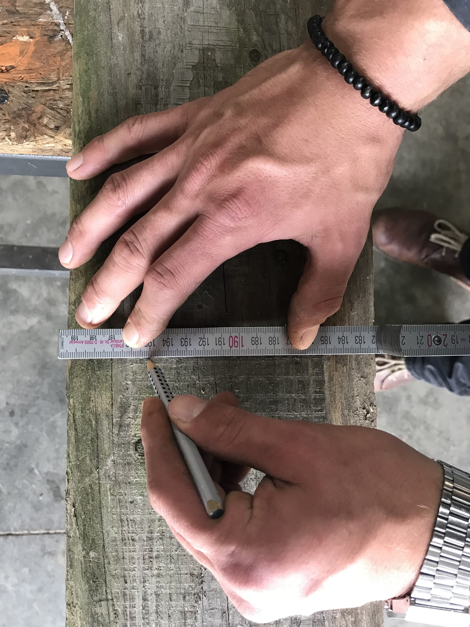 Wir messen an der Holzlatte 20cm der Länge nach ab und ziehen einen Strich. Ab dem Strich messen wir 25cm ab und ziehen noch einen Strich. Wir haben nun 2 Längen abgemessen, einmal 20cm und einmal 25cm.