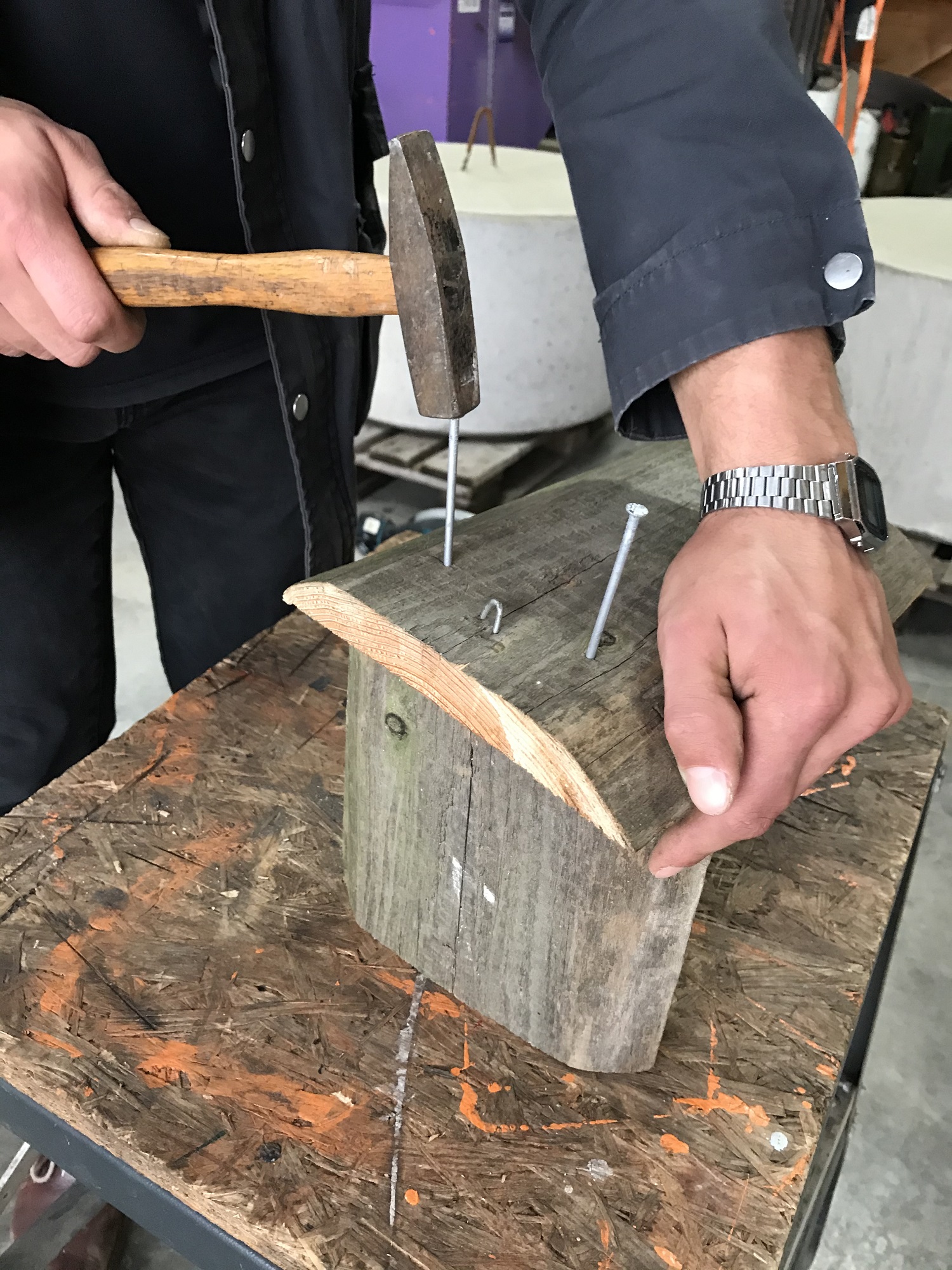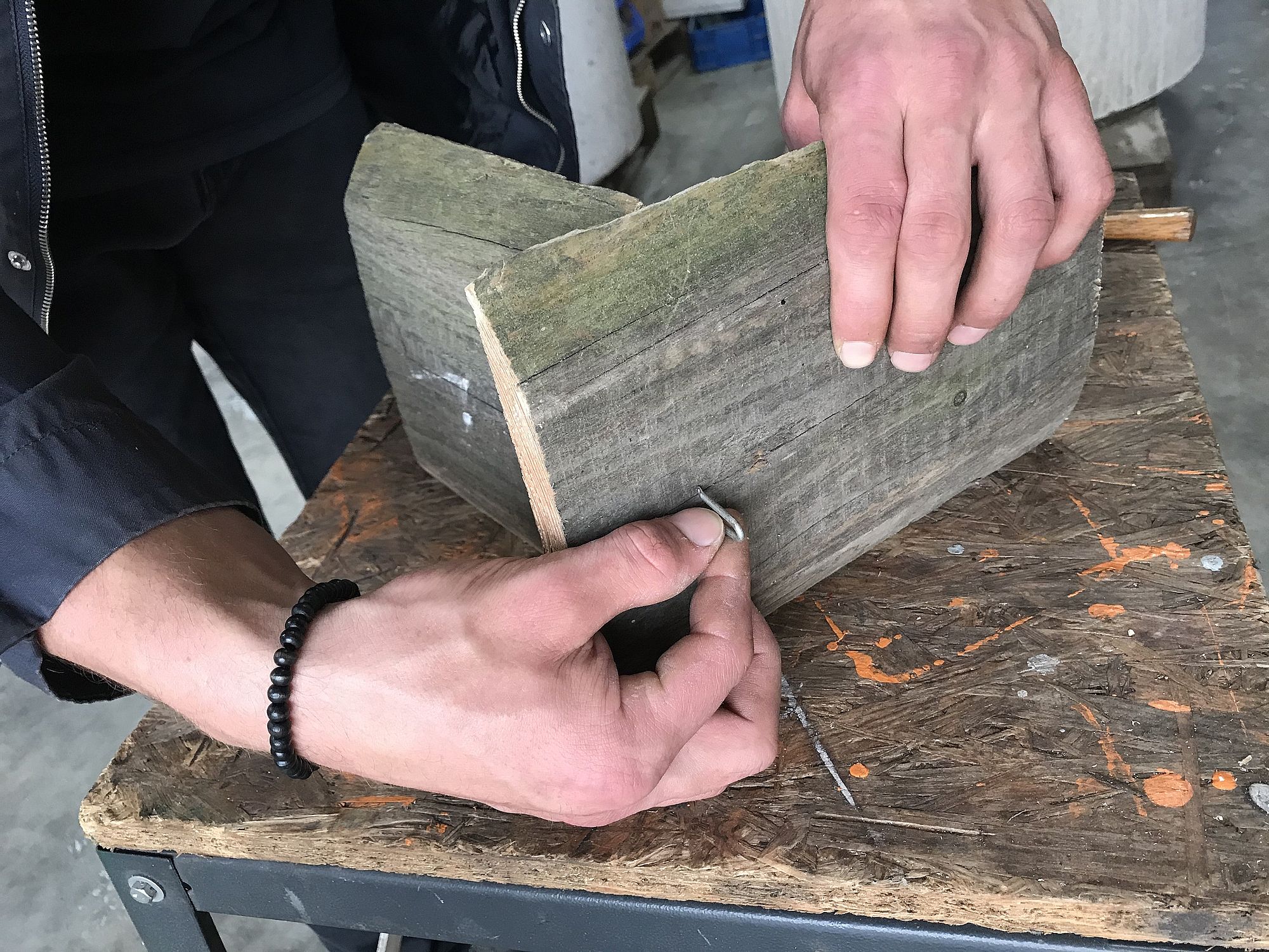 Wenn die Nägel schon ein gutes Stück in der einen Dachhälfte sitzen, setzt ihr die andere Dachhälfte darunter und nagelt sie ganz hinein. Bitte passt auf eure Finger auf. Das Dach ist anfangs ein bisschen wackelig, sobald die Nägel aber ein paar Zentimeter weit reingenagelt sind hält alles fest zusammen.