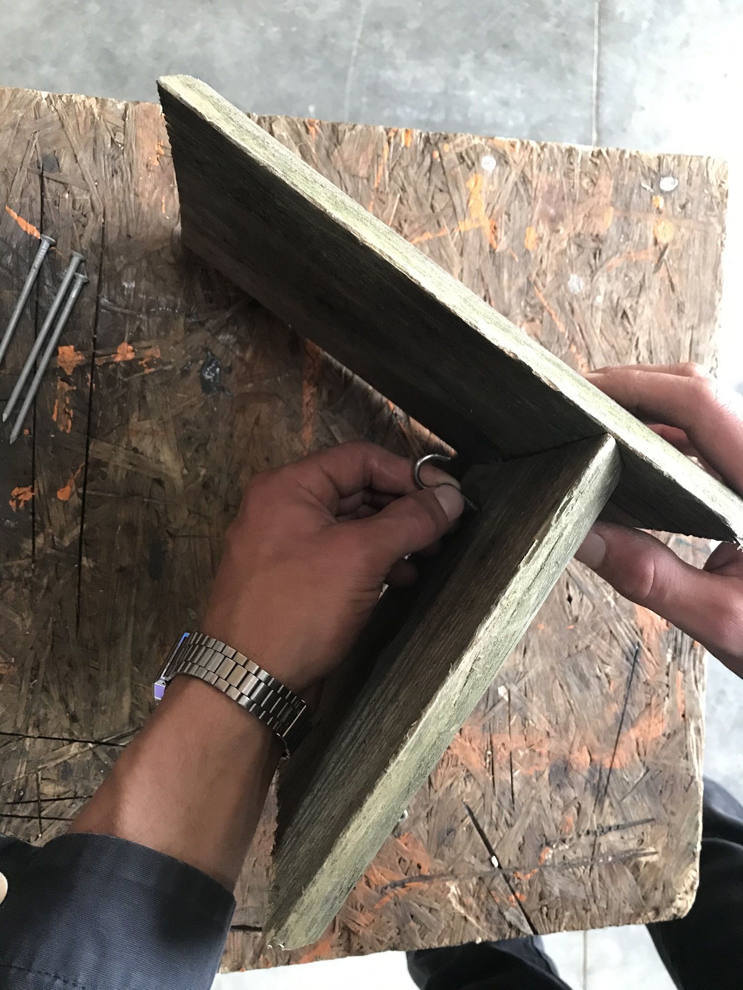 Wir können unsere zwei Dachteile nun aneinanderhalten um herauszufinden, wo die Haken eingedreht werden sollen. Da das eine Dachteil kürzer ist als das andere, können nachher beide Teile ganz einfach mit etwas Versatz aneinander genagelt werden (auf dem rechten Bild gut zu sehen)!