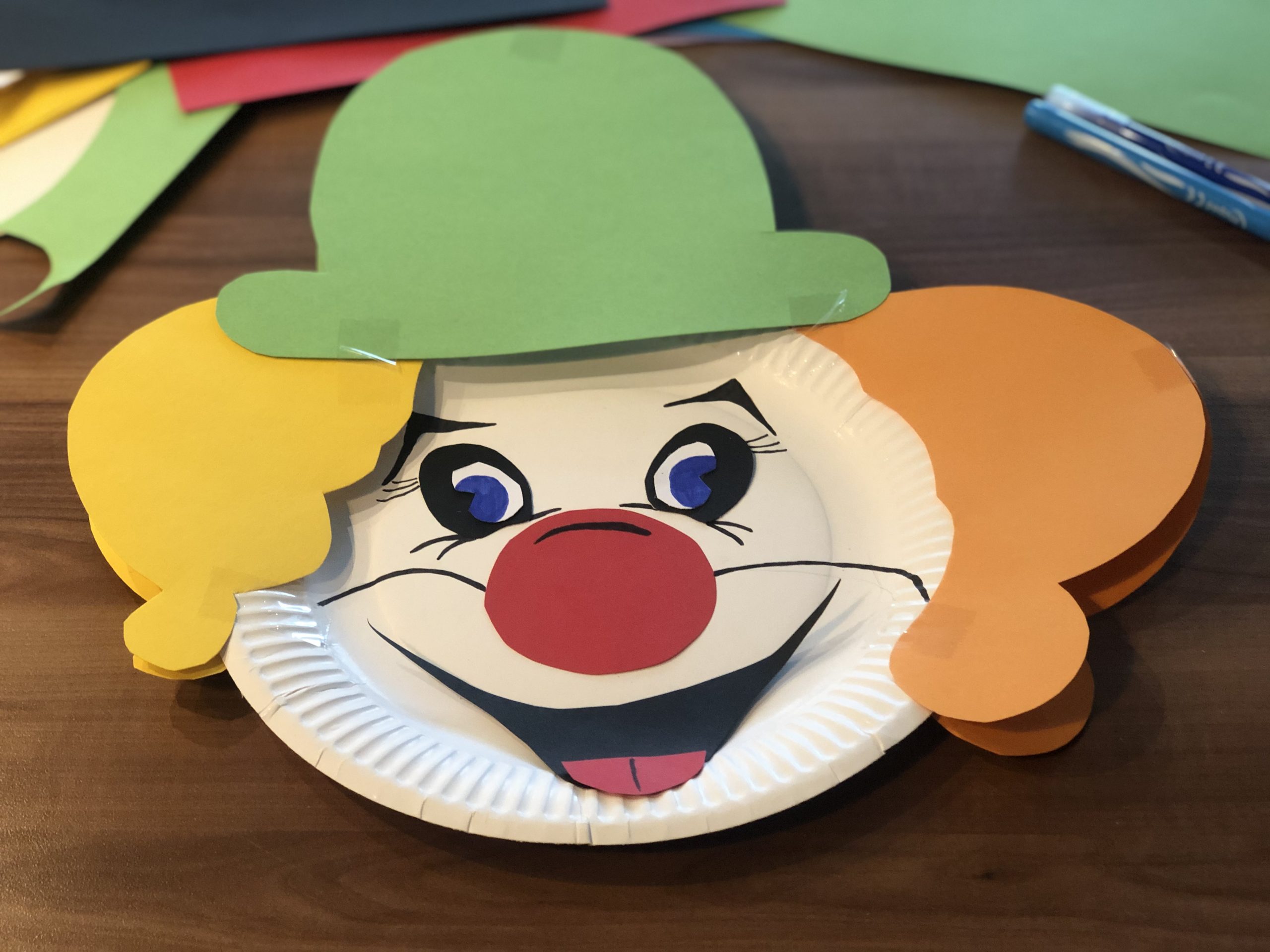 3. Für den Hut habe ich ebenfalls Tonkarton bevorzugt, da er fester ist als das Tonpapier. Schneidet nun einen Hut aus und klebt diesen an den oberen Rand des Papptellers, so dass er etwas schief und etwas über die Haare des Clowns ragt.
