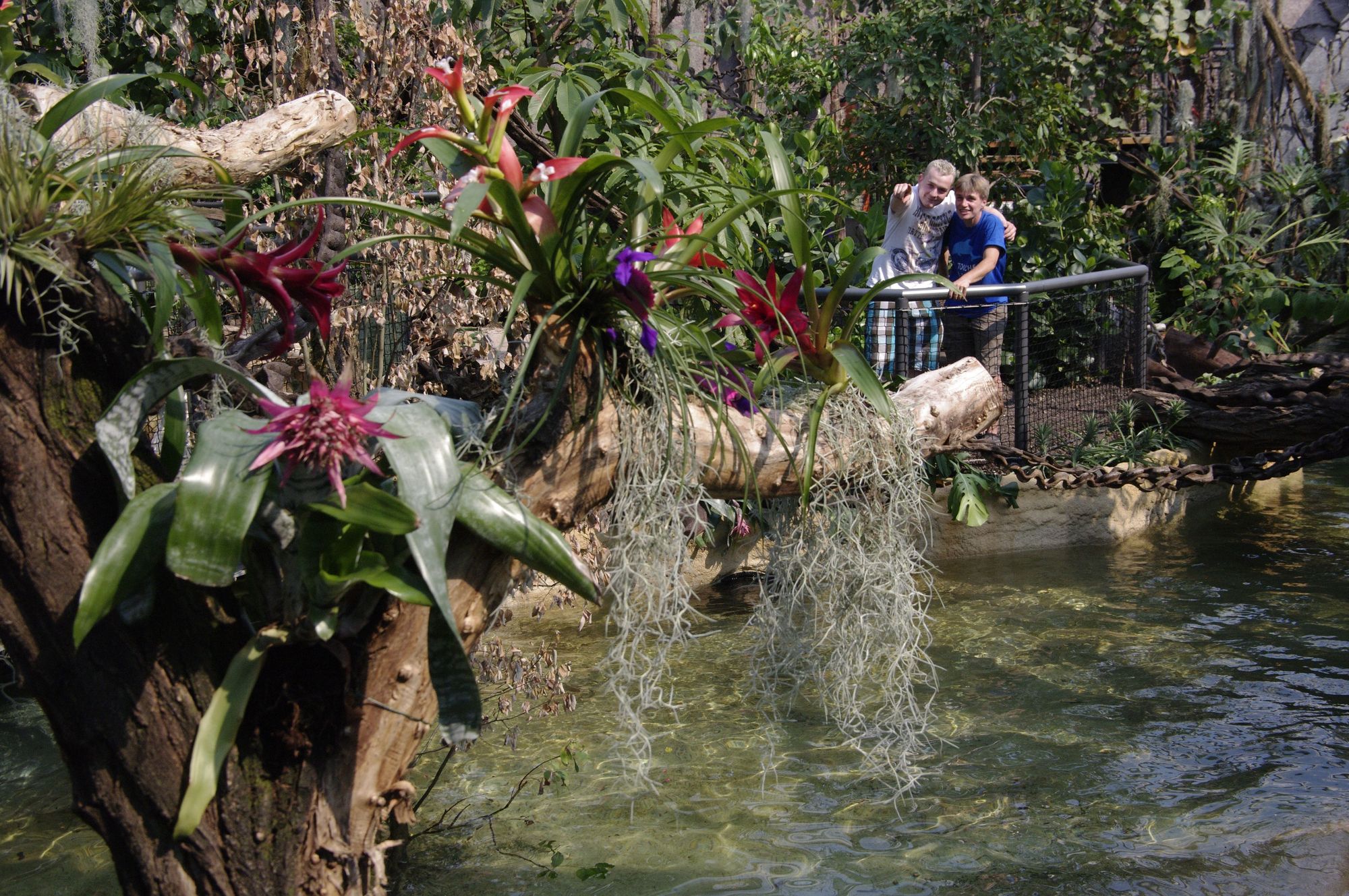 Hier ist immer Sommer. Und Jonas freut sich: „Die Jacke brauch‘ ich nicht.“ Und wirft die Winterjacke zu seiner warmen Decke, dem Schal und der Mütze im Kinderwagen. Jonas wieselt durchs Haus, sucht Fische im Wasser, freut sich über die Ameisen, die riesige Blattstücke schleppen, und hat seine Erkältung längst vergessen. Außer Jonas und seiner Mutter sind nur noch eine Tierpflegerin und ein älteres Paar im Haus. Es ist ein Gefühl wie im Urwald. Allein mit den Tieren und den riesigen Pflanzen. Das Haus ist tropisch-warm und voller üppiger Farben. In der prallen Dschungelwelt singen Frösche wie Vögel, tropische Vögel sitzen in den Ästen und neugierige Affen beobachten das Geschehen unter sich mit großen Augen. Ein echter Hingucker ist der orangefarbene Grüne Leguan. Wie ein Mini-Drache liegt er auf seinem Lieblingsast und lässt sich bewundern.