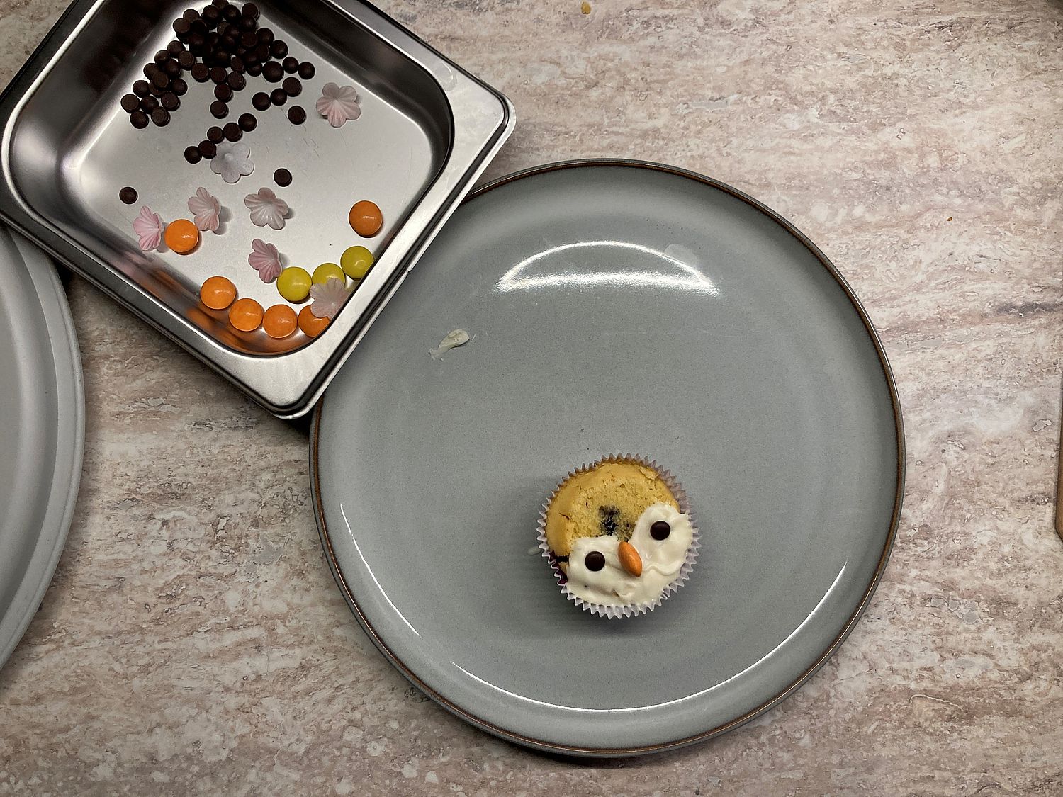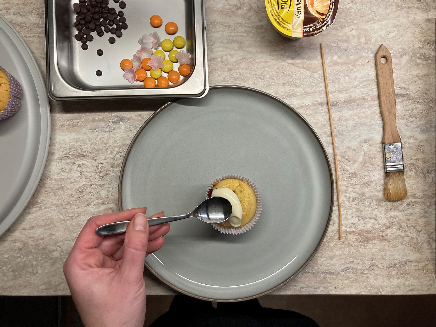 Nun habe ich die Muffins alleine weiter verarbeitet. Mein Sohn war zufrieden mit dem Ergebnis und er hat sich lieber auf andere Sachen konzentriert – das ist natürlich okay. Da die Muffins aufgegangen sind habe ich oben die „Berge“ mit einem Messer abgeschnitten.