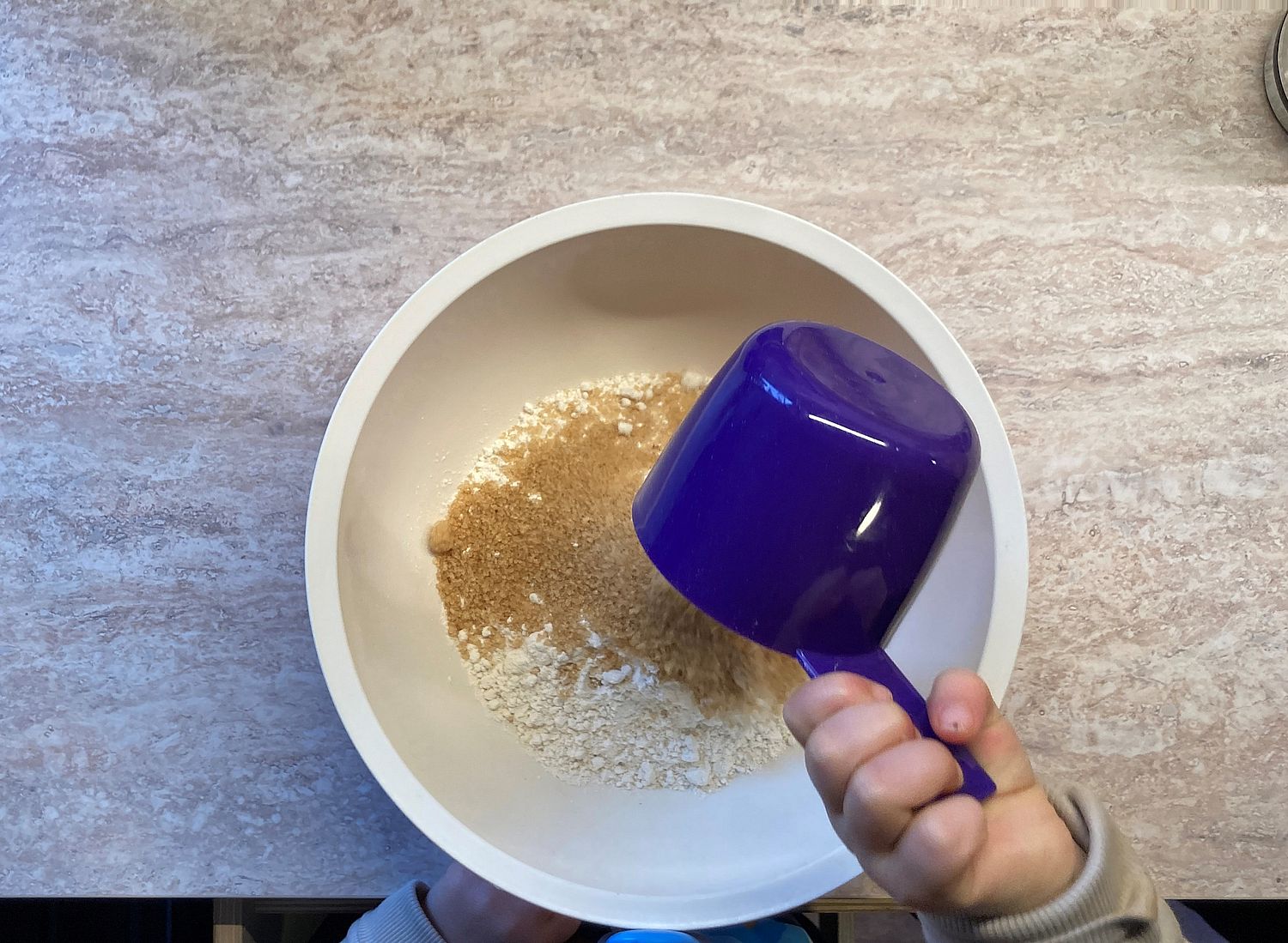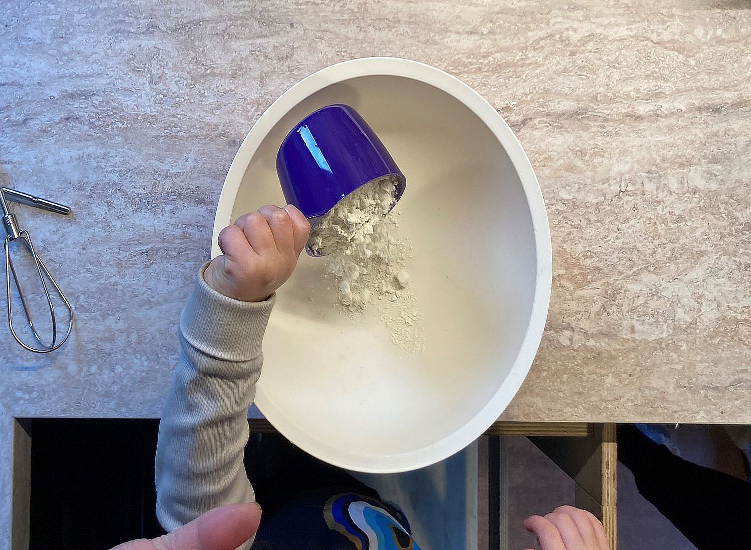 Nun beginnen wir erstmal damit, dass wir den Ofen auf 180 Grad Umluft anstellen. Mein Kind hat sich auf seinen Lernturm direkt an die Küchenarbeitsplatte gestellt. So konnte er alles überblicken und ist überall hingekommen. Die große Schüssel habe ich vor ihm platziert und ihm die Zutaten nacheinander gereicht. Er konnte alles eigenständig in die Schüssel schütten. In die Schüssel kommt: 3 Cups Mehl, 1 Cup Zucker, 1 Cup Öl, Backpulver, Eier und Zitronensaft.