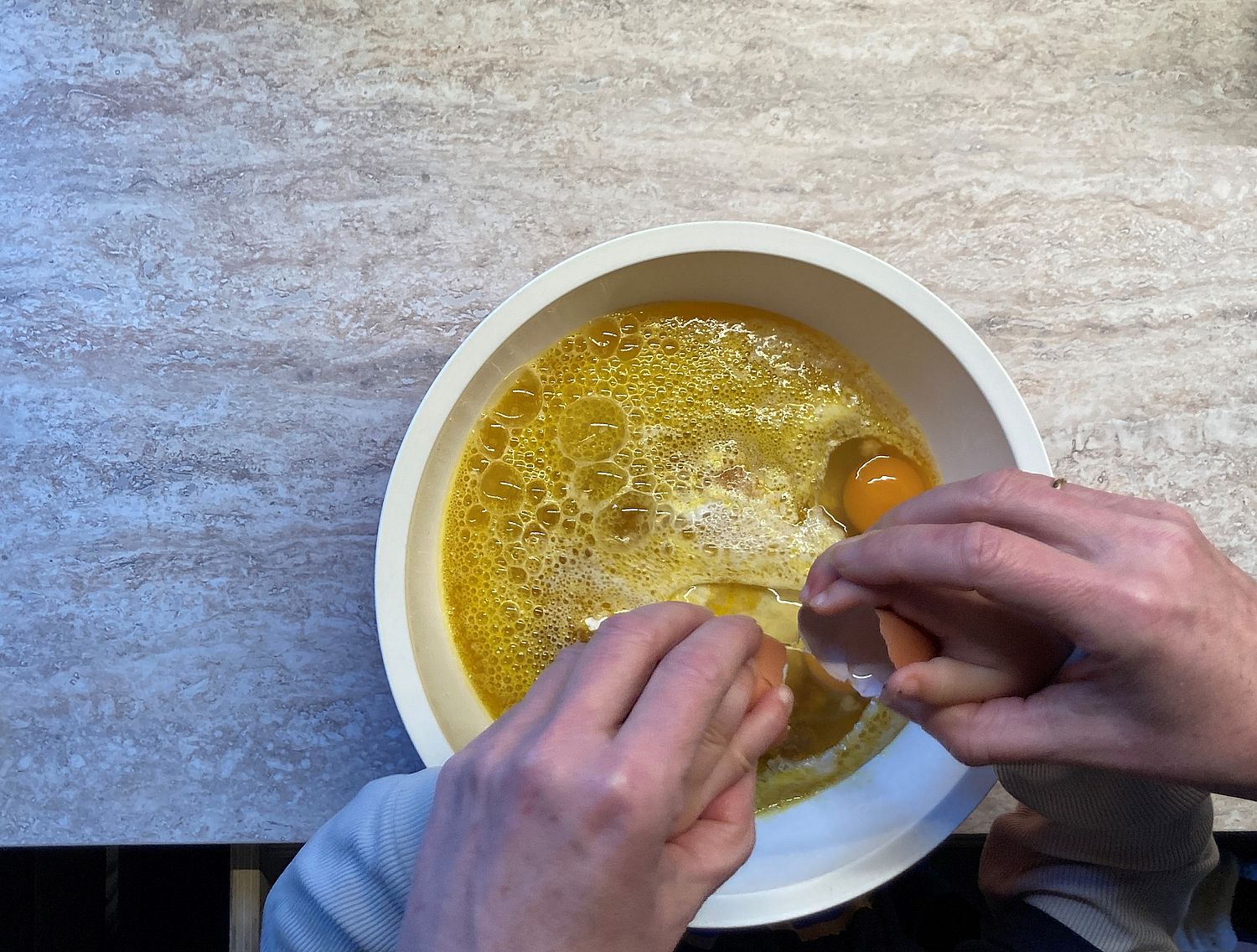 Im nächsten Schritt wird alles miteinander verrührt. Mein Kind durfte das Handrührgerät mit der einen Hand, und die Rührschüssel mit der anderen Hand halten. Das Gerumpel des Rührers hat ihm super gut gefallen und er konnte direkt sehen und spüren, wie aus den ganzen Zutaten ein süßer Teig entsteht.
