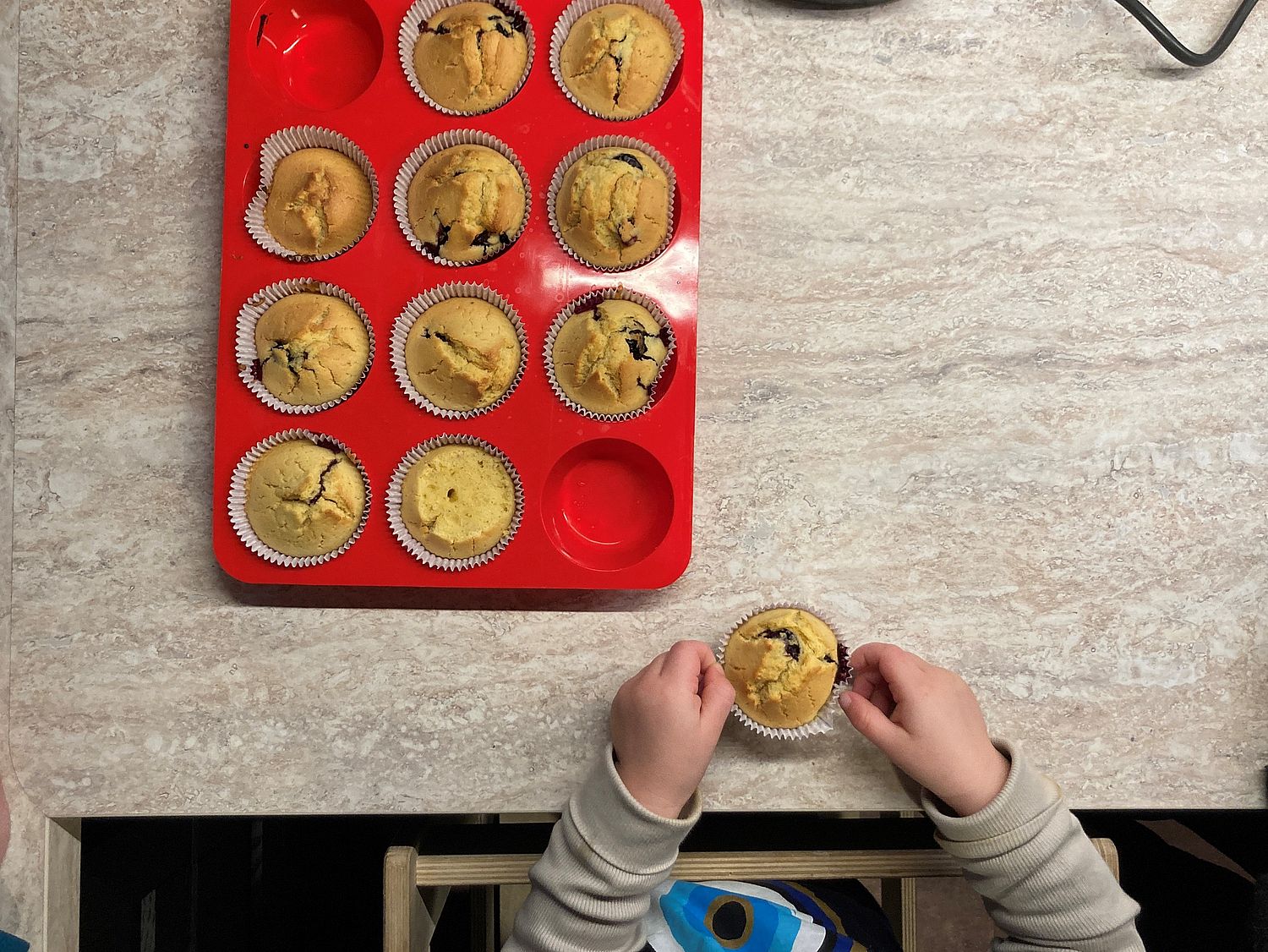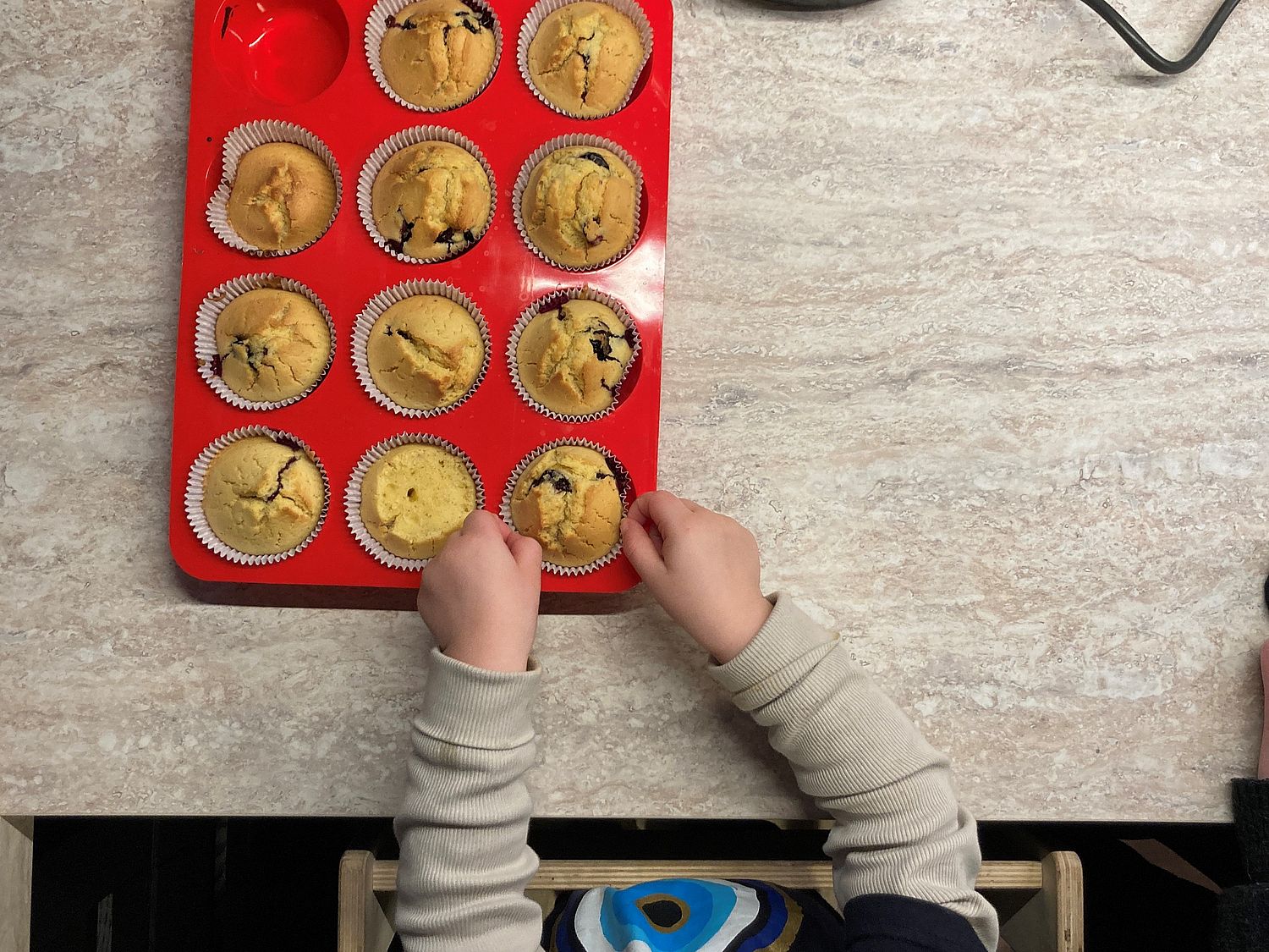 Dann wartet noch eine weitere Aufgabe auf die Kinder. In unserem Fall habe ich mein Kind gebeten, die fertigen Muffins mitsamt dem Förmchen aus dem Muffinblech zu heben und daneben hin zu stellen. Das hat ihm viel Spaß gemacht und ich fand es wichtig, dass er das Endprodukt seiner Arbeit sieht.