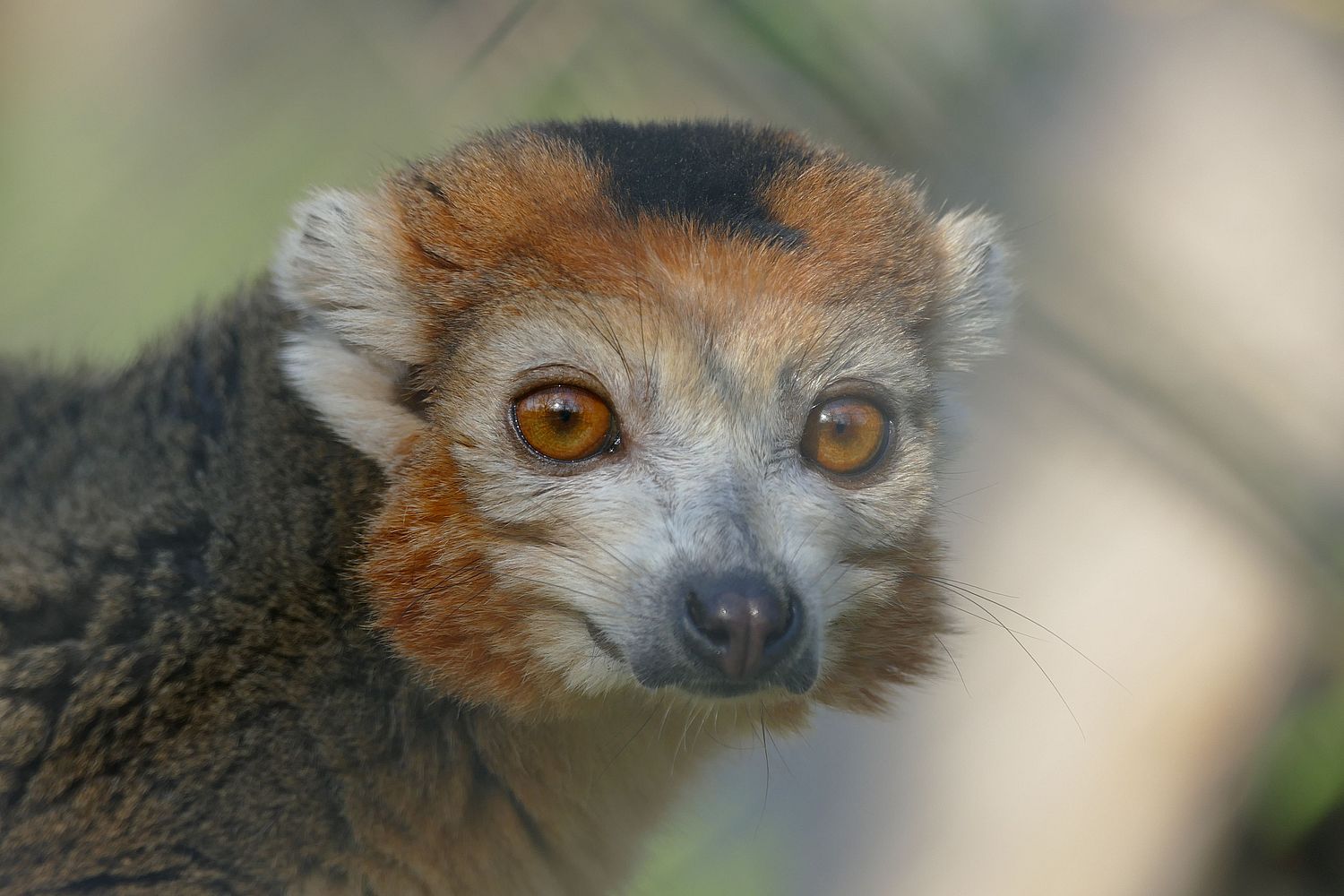 Doch da gibt es noch Mama und sie hat ihren Nachwuchs stets im Auge. Und nicht nur den. Mama ist die Herrin im Haus. Da bleibt für Papa Kronenmaki nur noch eine Nebenrolle übrig. Allerdings eine hübsche. Denn männliche Kronenmakis sind wahre Schönheiten mit ihrem orangefarben umrandeten Fellgesicht. Das Weibchen ist da viel unscheinbarer in seinem grauen Fell. Beide, Männchen und Weibchen, haben auch etwas gemeinsam: eine v-förmige Zeichnung am Kopf nämlich. Diese erinnert an eine Krone und daher auch der deutsche Name dieser Makis.