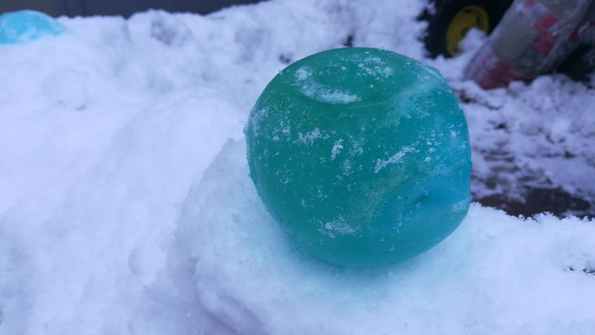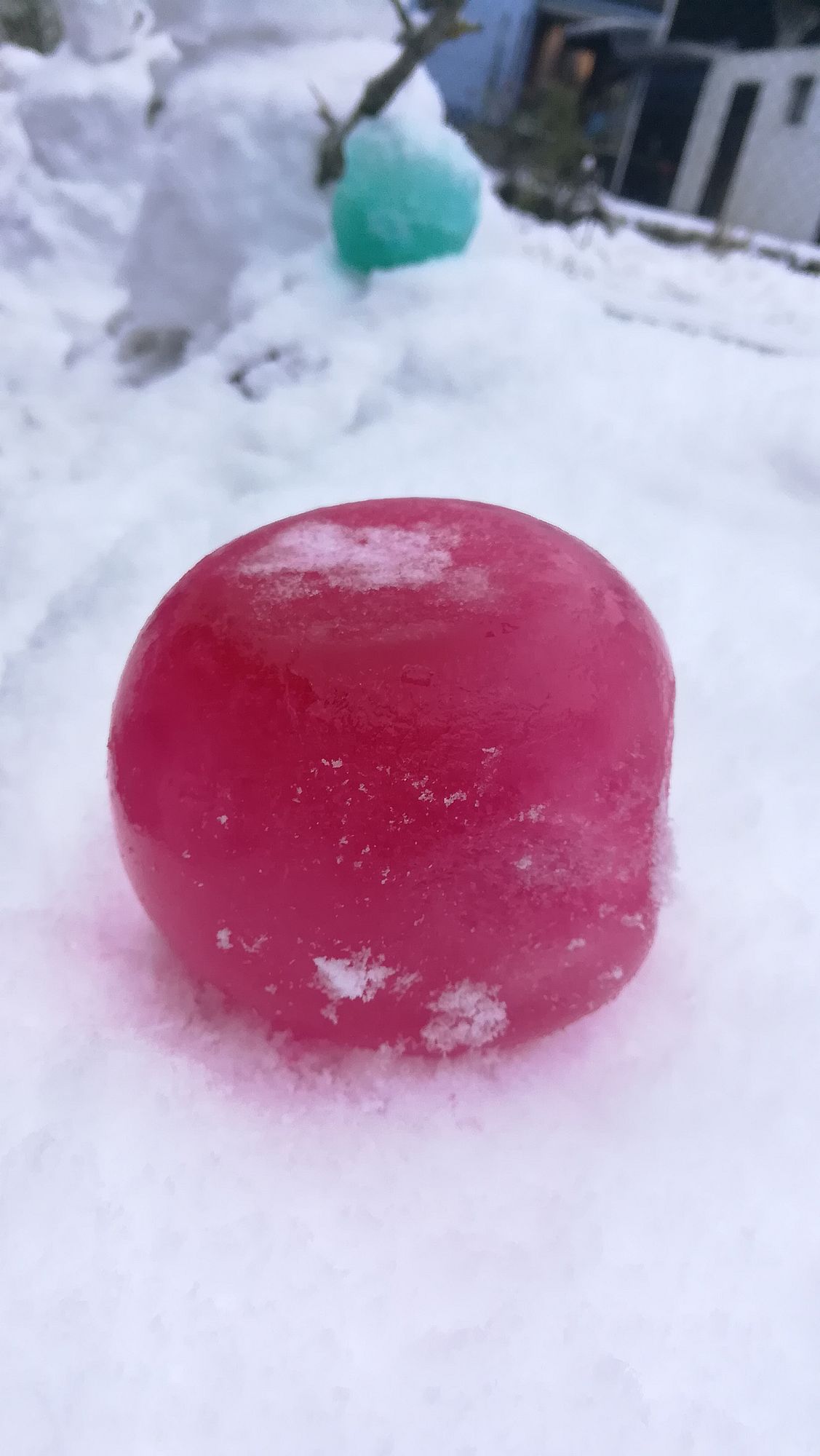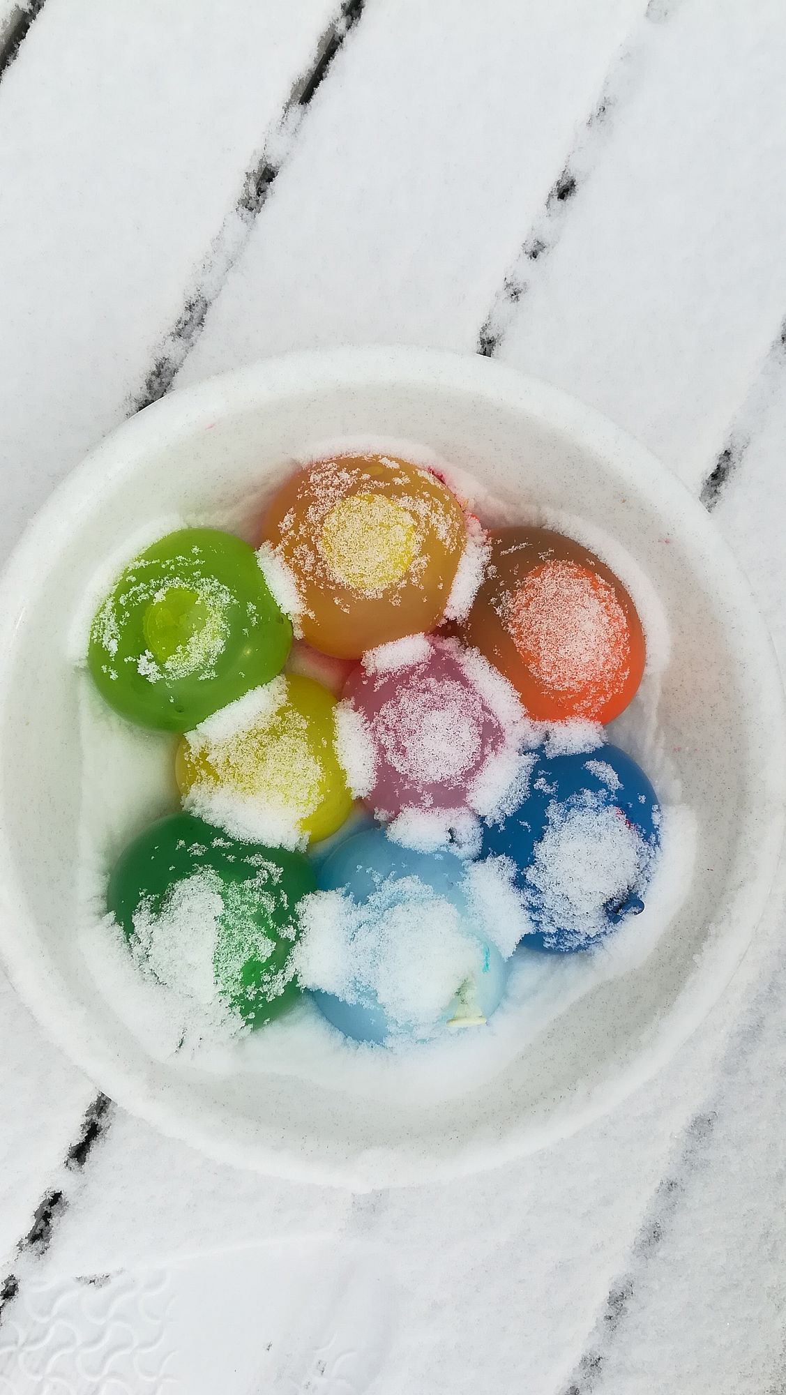 Zum einen haben wir dafür in Luftballons je einen Spritzer Lebensmittelfarbe getan und diese dann mit Wasser befüllt. Über Nacht auf dem Balkon sind diese gefroren und zu wunderschönen bunten Eiskugeln geworden. Damit lässt sich auch prima eine Schneeburg verzieren.