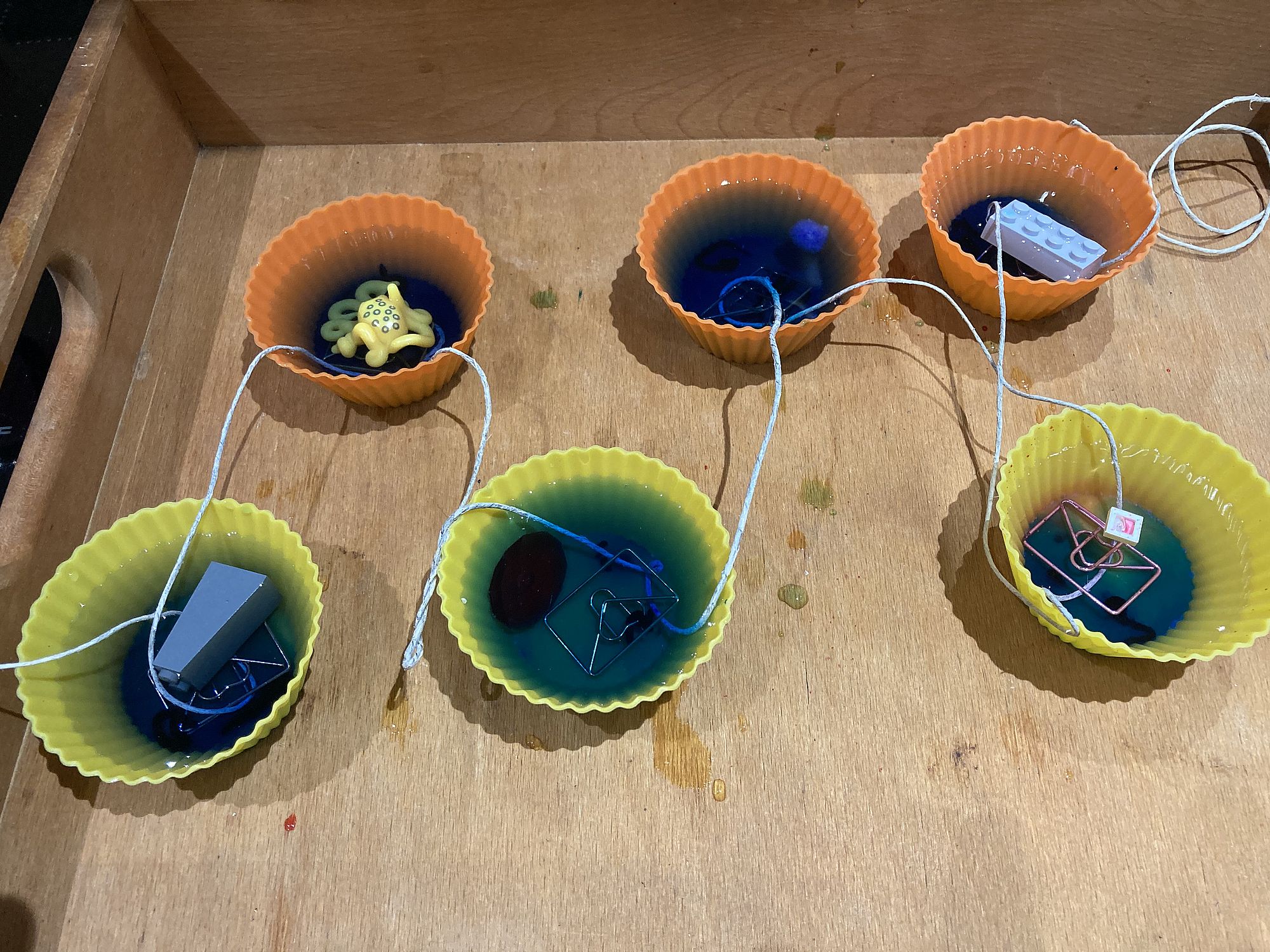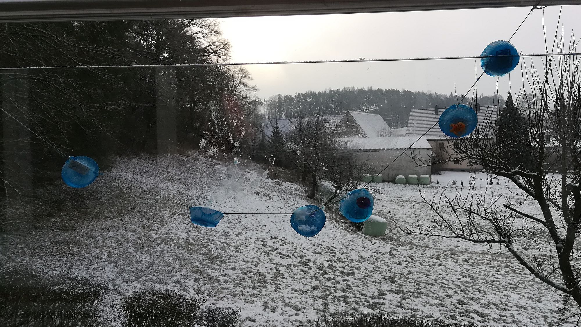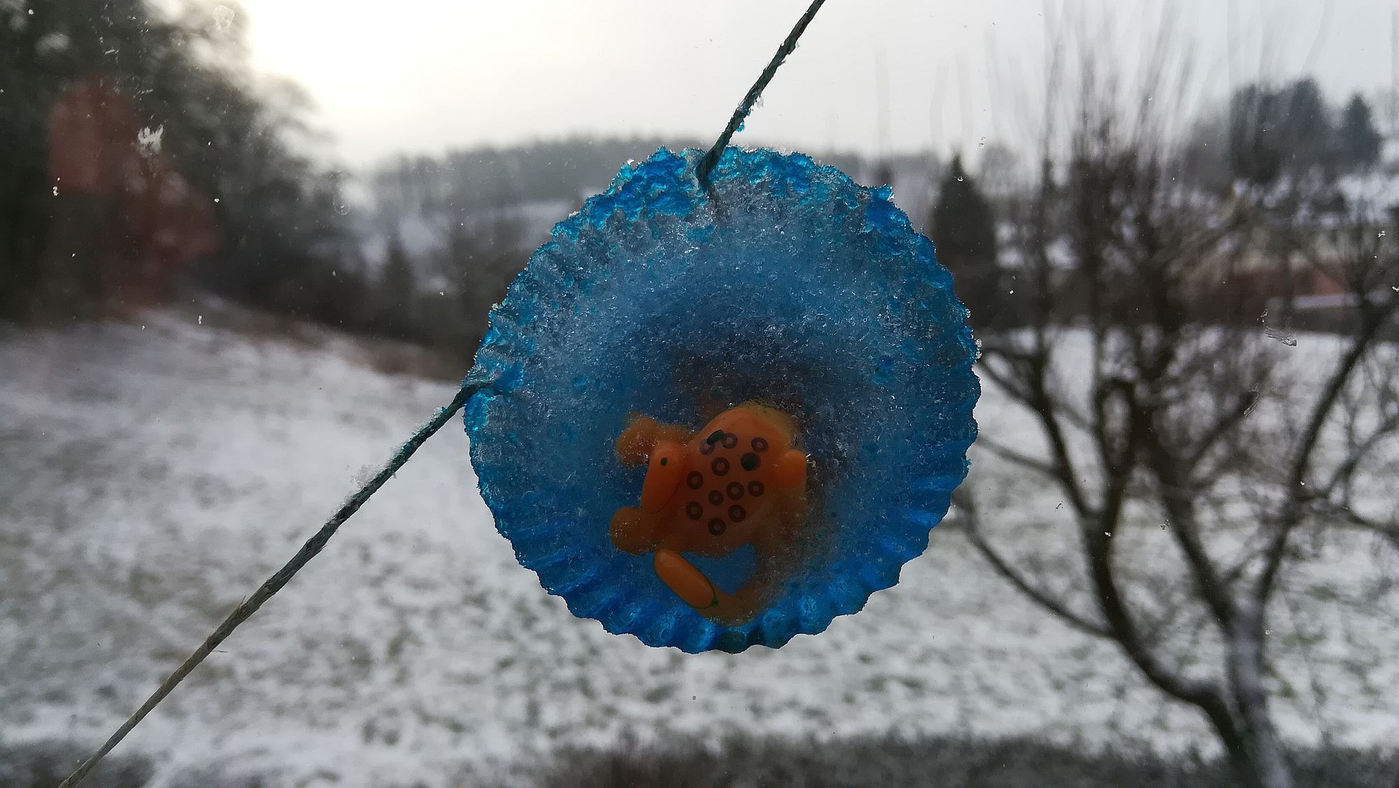 Außerdem haben wir Muffinförmchen aus Silikon mit Wasser gefüllt, das wir ebenfalls mit Lebensmittelfarbe eingefärbt haben. Hinein kommt eine Schnur und kleine Gegenstände z.B. kleine Spielfiguren. Über Nacht gefriert das Wasser und die entstandene Girlande kann aufgehängt und bestaunt werden. Und dann können die Kinder beobachten, wie das Eis langsam schmilzt und die Spielfiguren frei gibt wenn die Temperaturen wieder steigen.