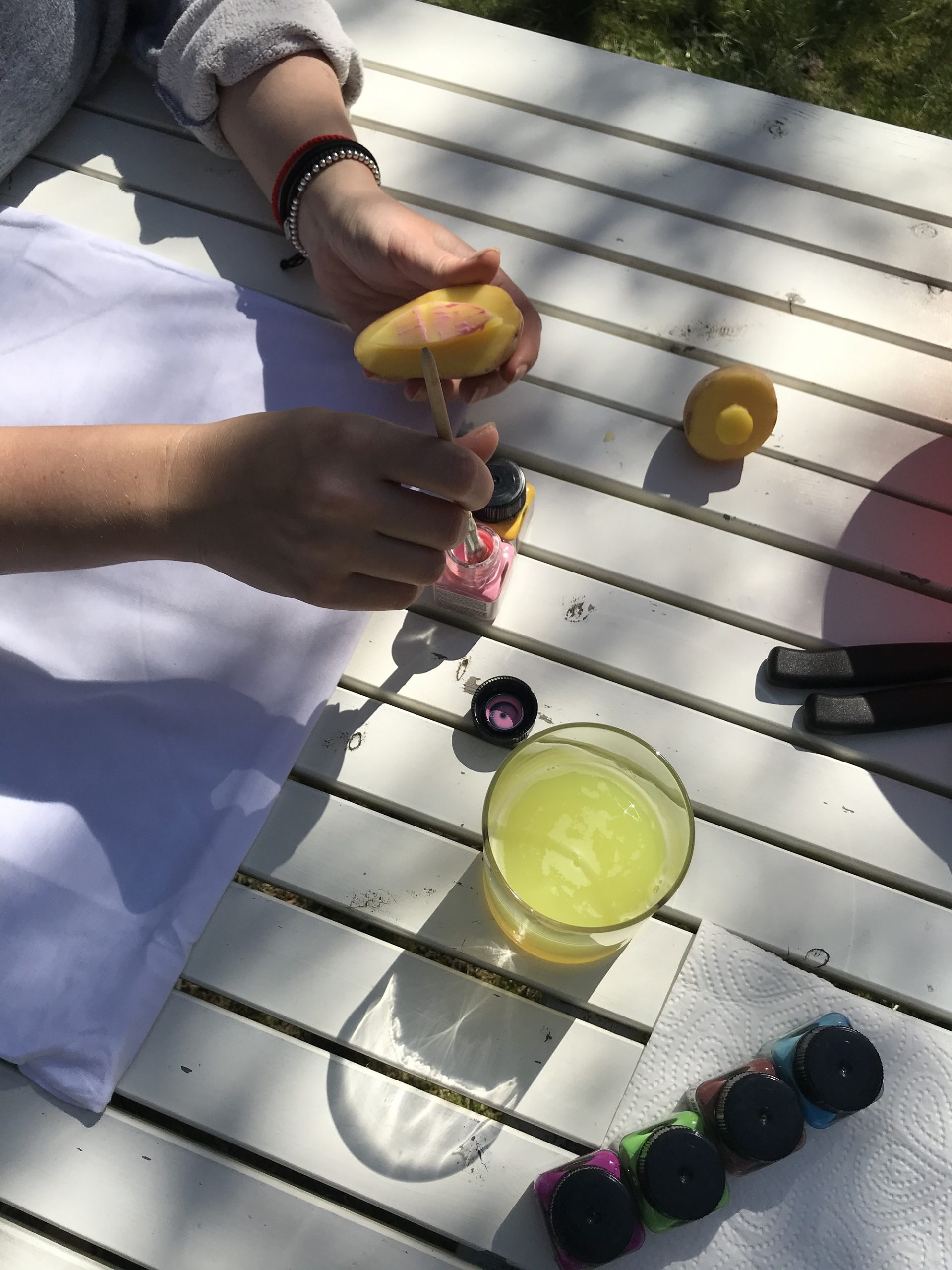 Da die Messer scharf sein müssen, empfehle ich euch, das schnitzen selbst zu machen. Kleinere Kinder können sich währenddessen zum Beispiel die Farben aussuchen oder sich überlegen, wo die Blumen platziert werden sollen.