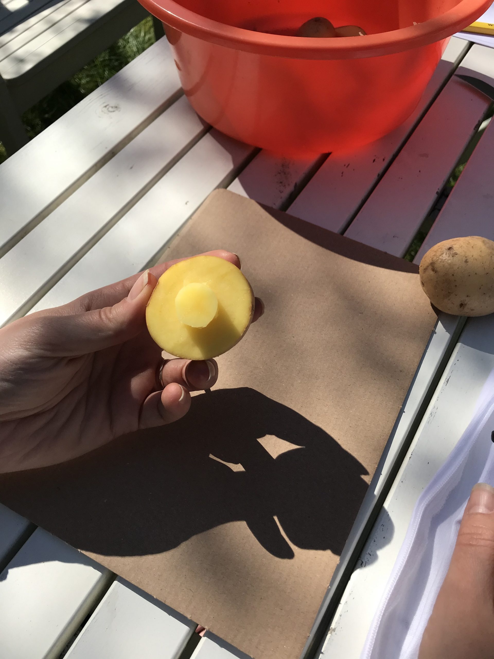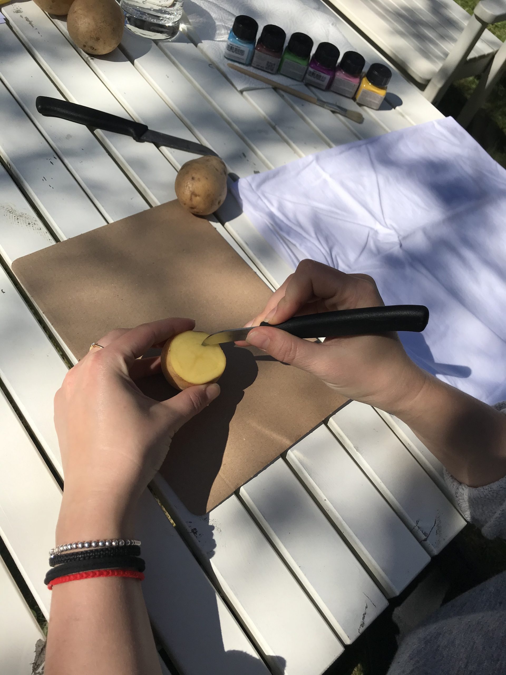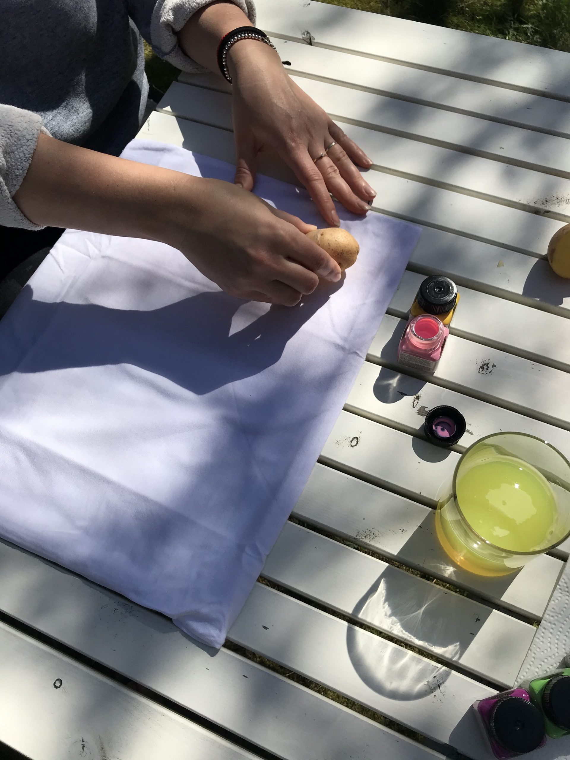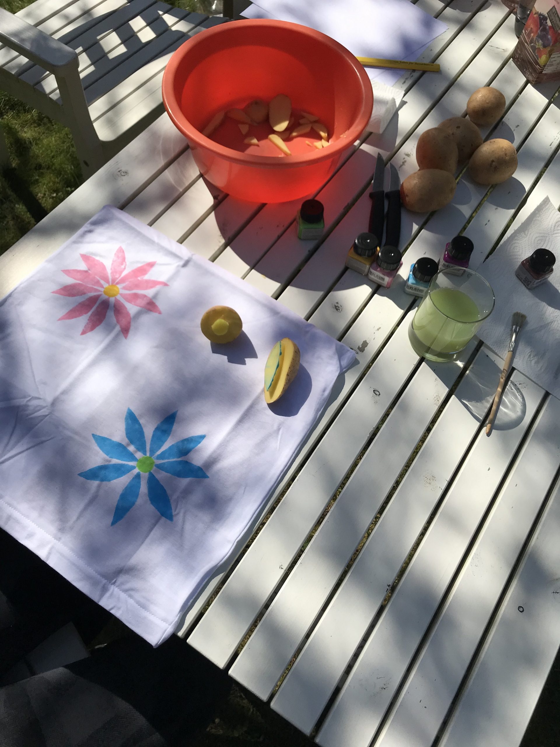 Heute bringen wir den Frühling auf den Tisch und auf das Sofa! Wir bedrucken uns Tischdecken und Sofakissenbezüge. Wir brauchen keine teuren Stempel oder Maschinen. Das Ganze funktioniert wunderbar mit rohen Kartoffeln. Klingt seltsam? Probiert es aus, ihr werdet staunen wie leicht es funktioniert! Viel Spaß beim Schnitzen, bepinseln und ausprobieren!