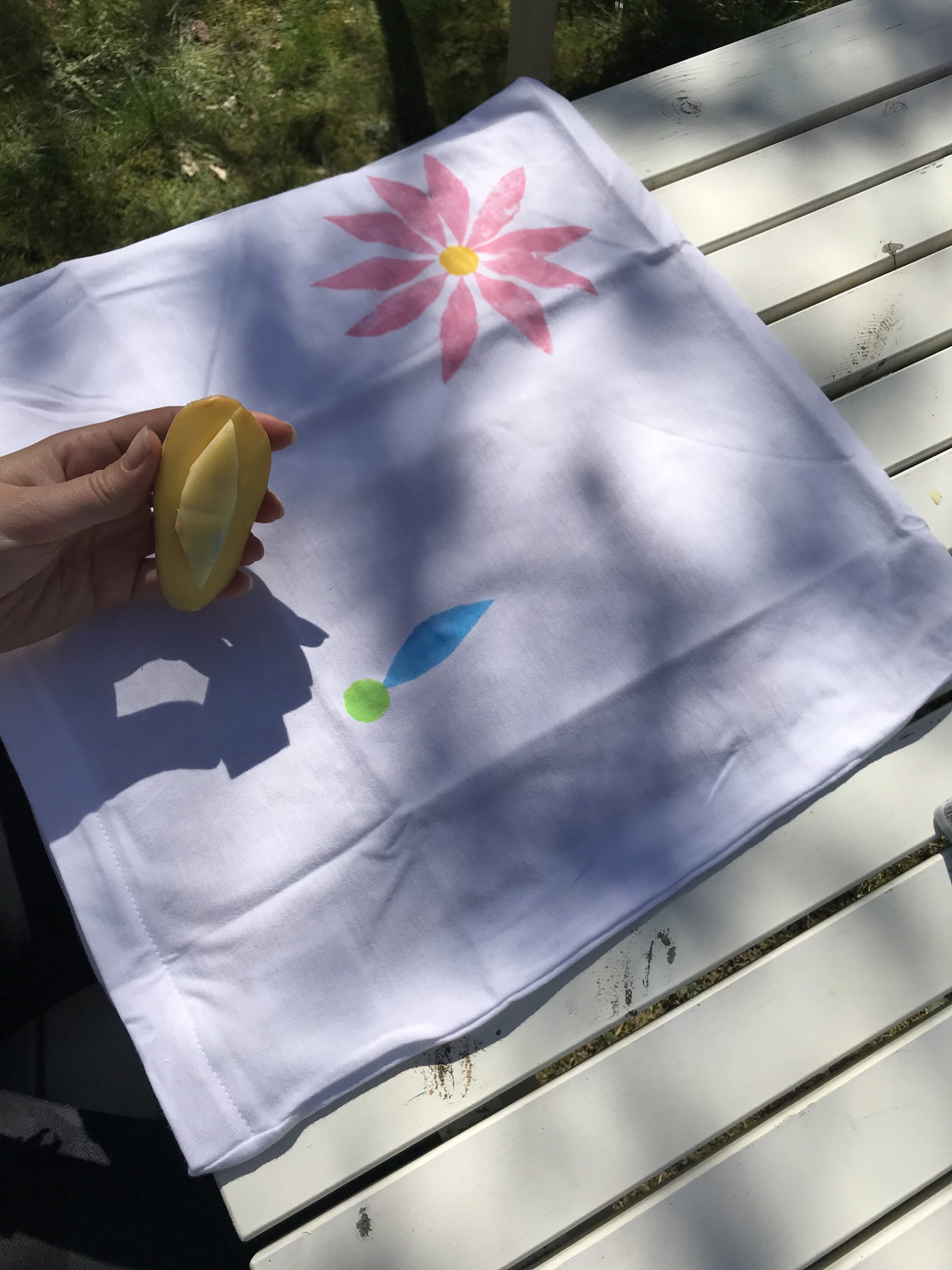 Die Farben die ich verwendet habe, werden fixiert, indem man darüber bügelt sobald die Farbe trocken ist. Dann lassen sich die Tischdecken und Kissenbezüge bei bis zu 60 Grad waschen!
