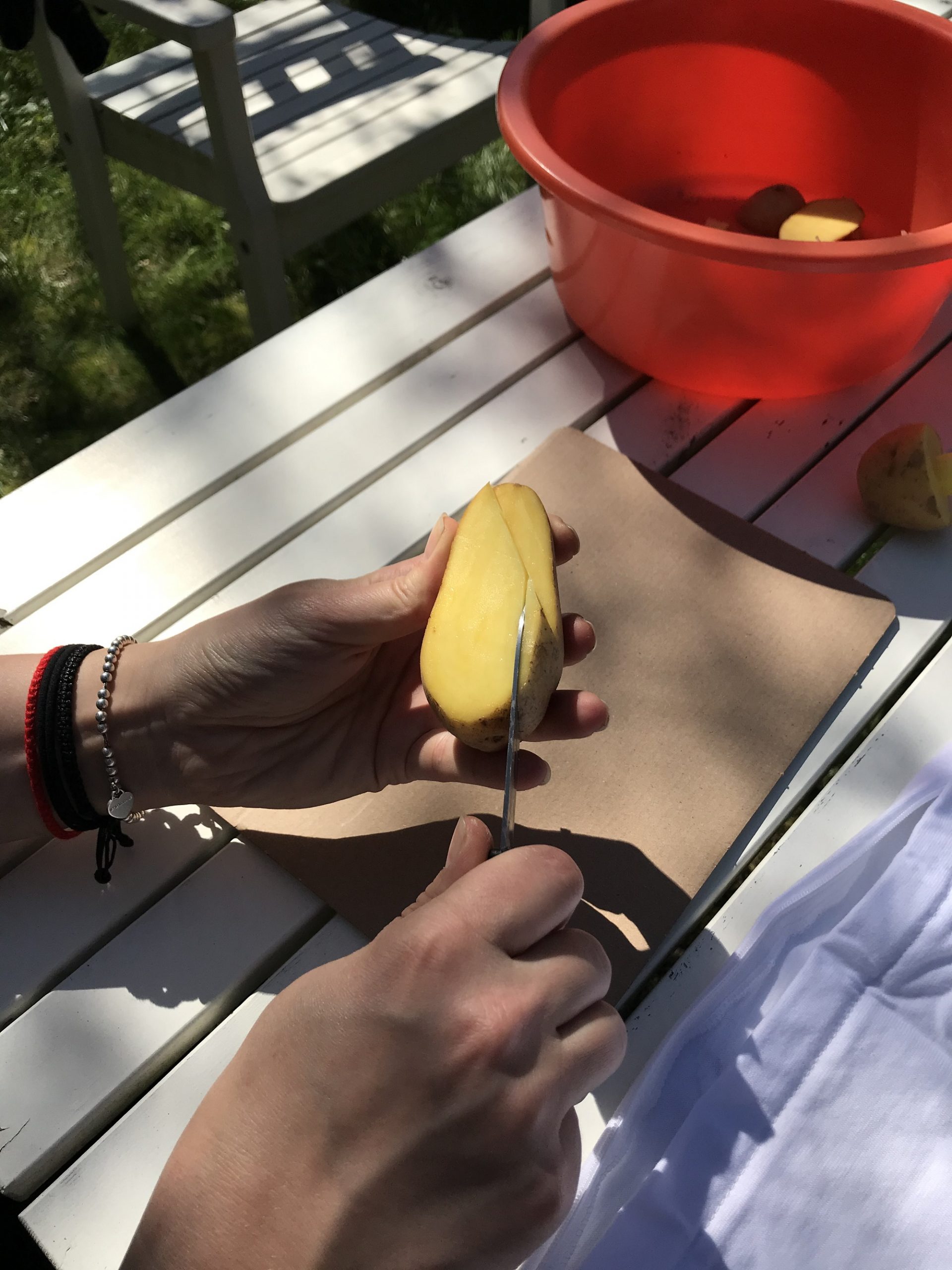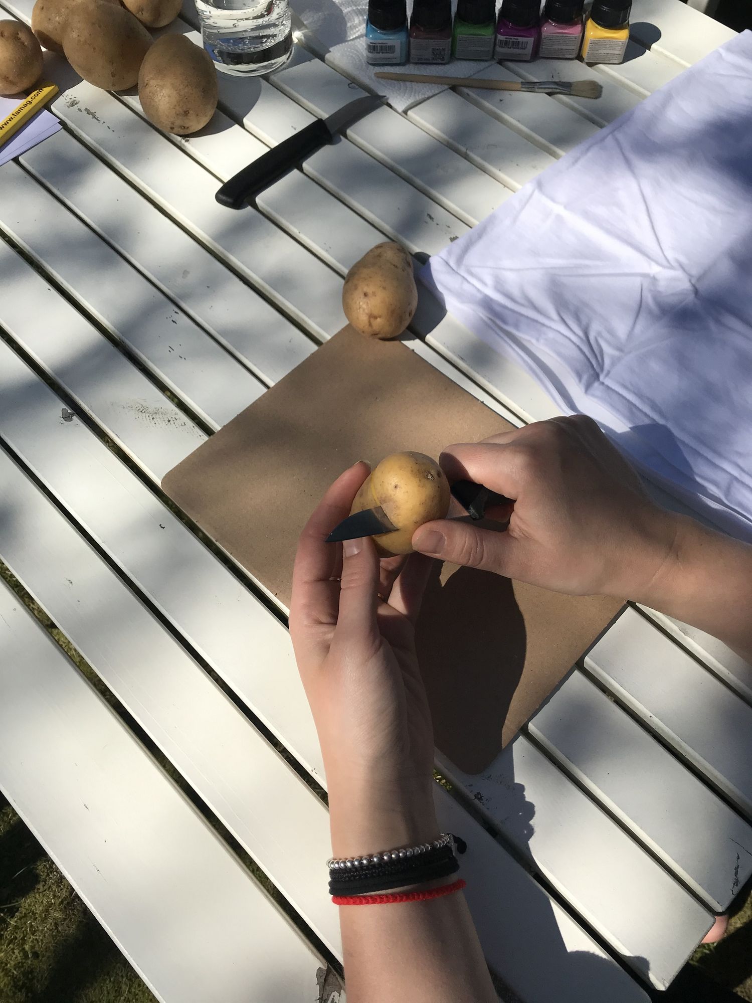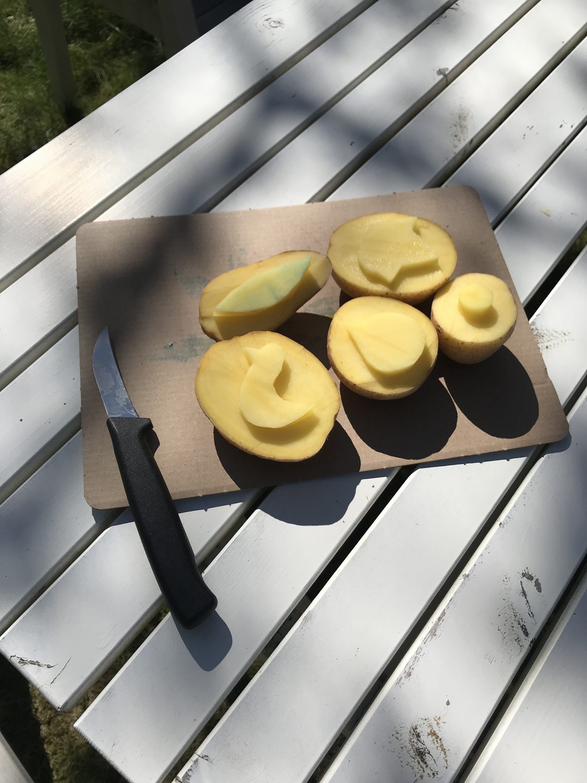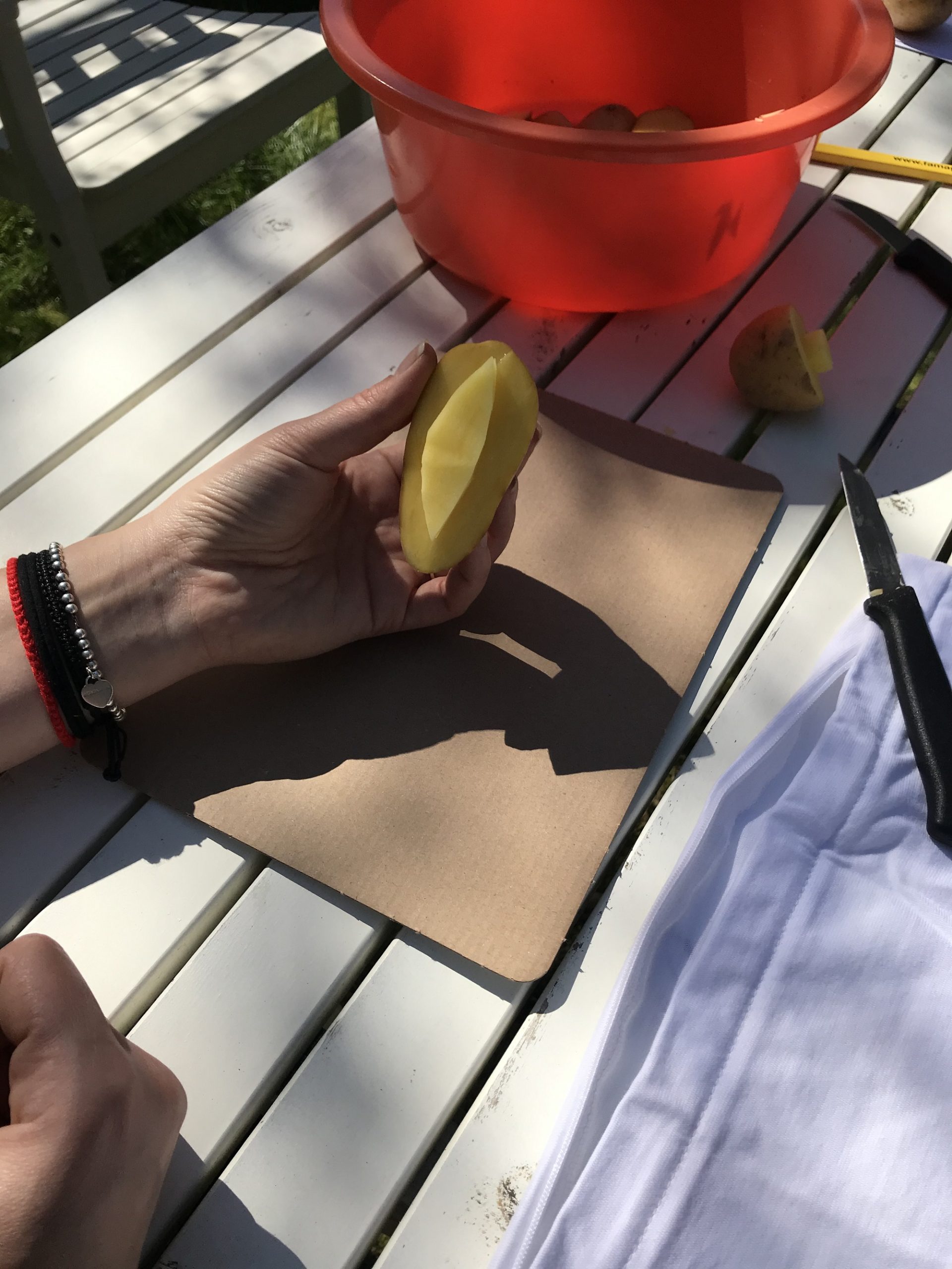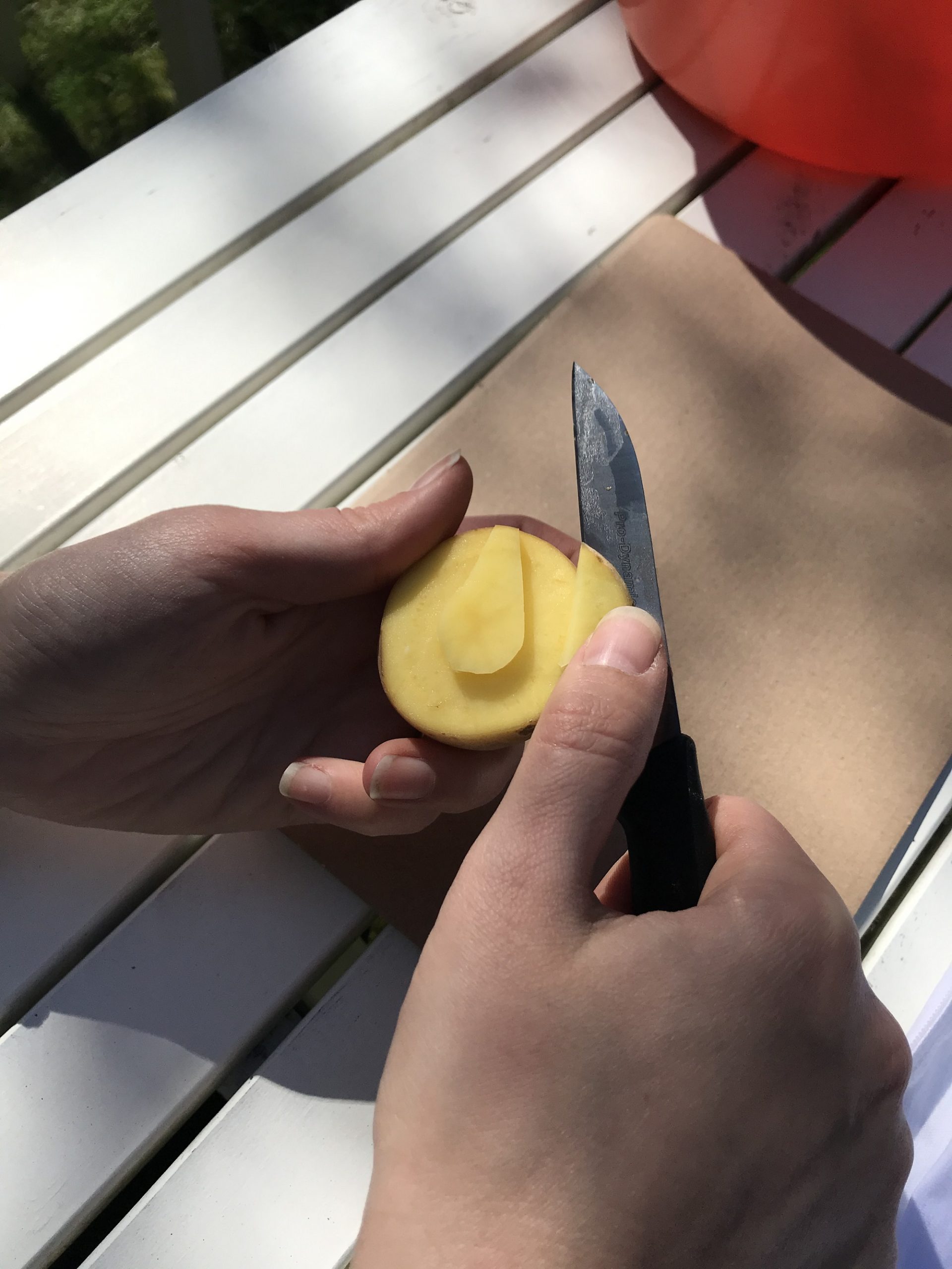 Und genau so geht es mit dem Blütenblatt weiter – ich schneide die Kartoffel gerade durch, ritze die Form des Blattes vor und schnitze von außen nach innen.