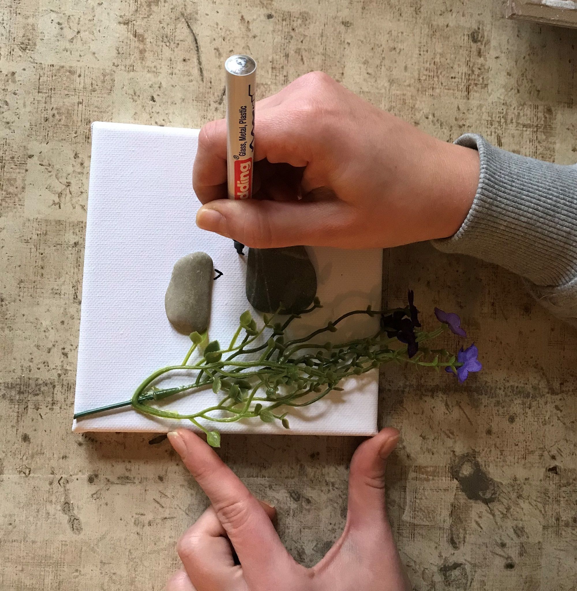 Wenn mir die Position der Materialien so gefällt, klebe ich alles fest und drücke die Steine fest auf die Leinwand.