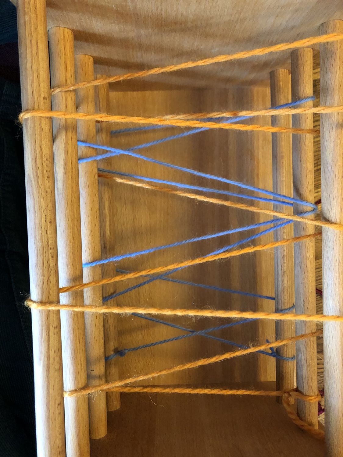 - Das Gleiche macht ihr dann mit einer anderen Farbe. Natürlich könnt ihr aber auch bei einer Farbe bleiben. Mir persönlich gefiel es in unterschiedlichen Farben einfach besser. Bei mir kam ein Hocker mit Sprossen zum Einsatz, wie Ihr in den Bildern sehen könnt. Um so mehr Wolle ihr durch die Löcher zieht um so mehr gleicht das Ganze einem Labyrinth.