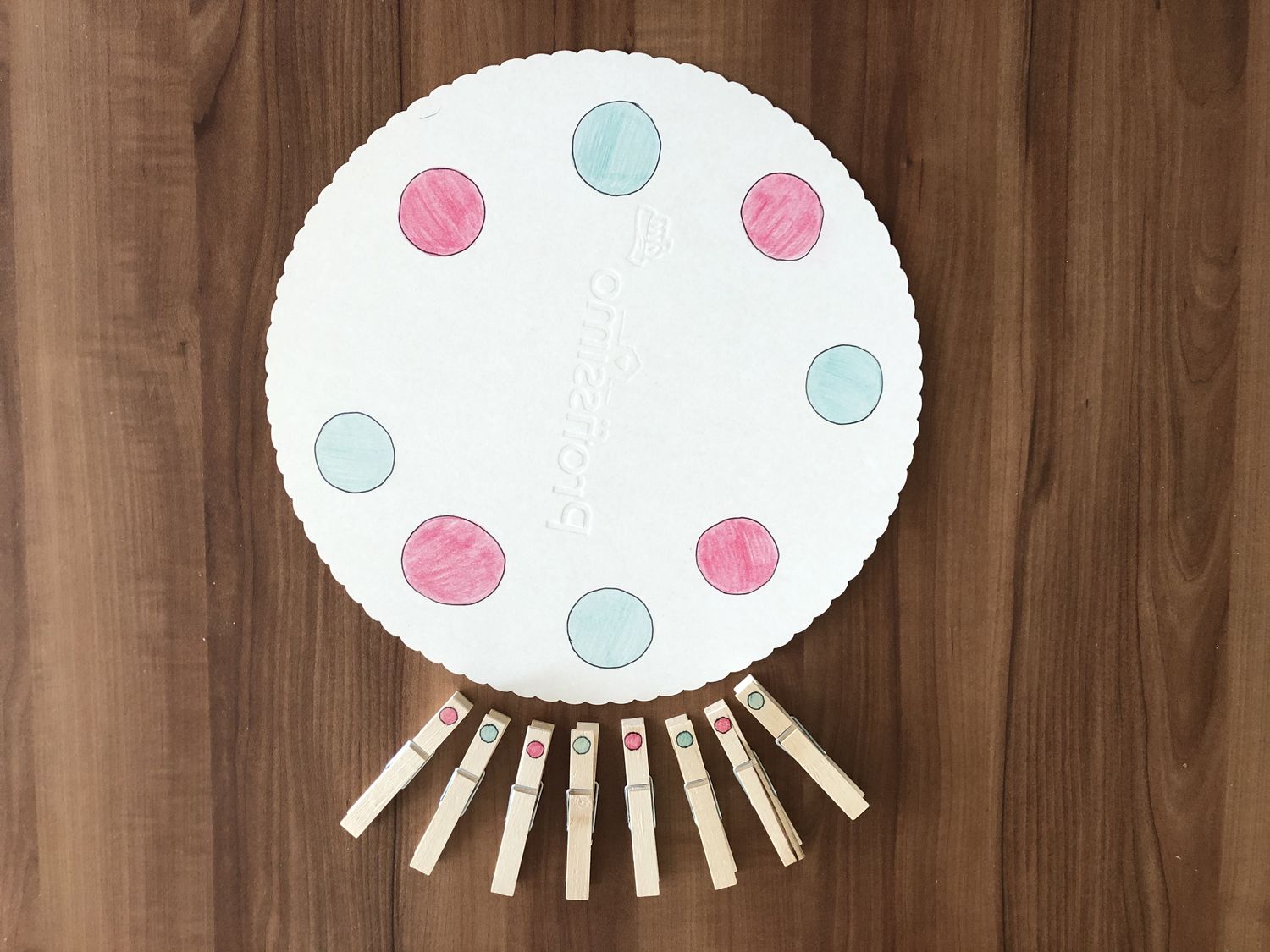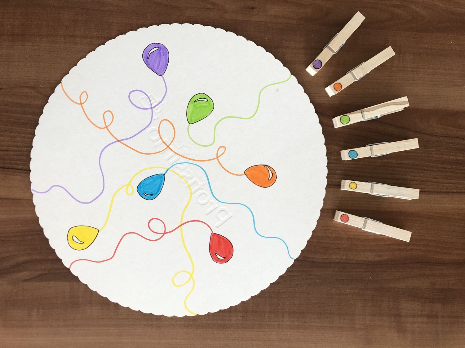 Damit die Luftballons „nicht davonfliegen“ müssen sie mit der jeweils richtigen Wäscheklammer festgehalten werden. - Die Aufgabe ist es nun, die Farbe auf der Wäscheklammer der jeweiligen Schnur auf dem Pappteller zuzuordnen und dort an den Rand des Papptellers zu klemmen.