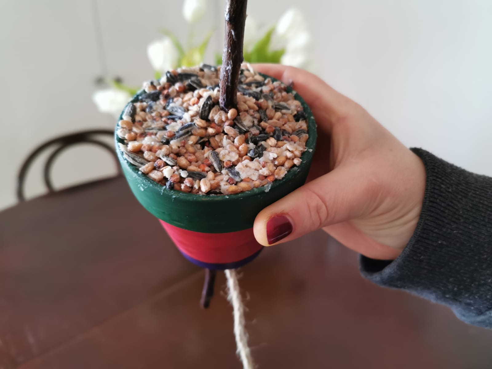 7.) Anschließend könnt Ihr den Blumen-, oder besser gesagt Futtertopf, befüllen und auf Eurem Balkon oder im Garten aufhängen.