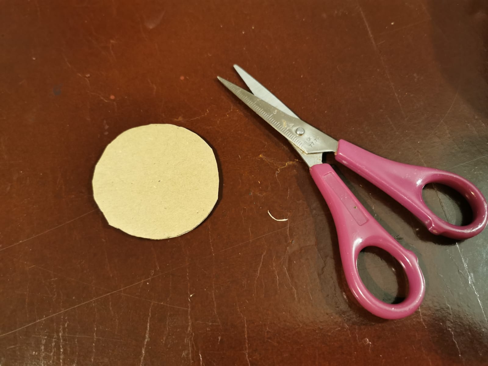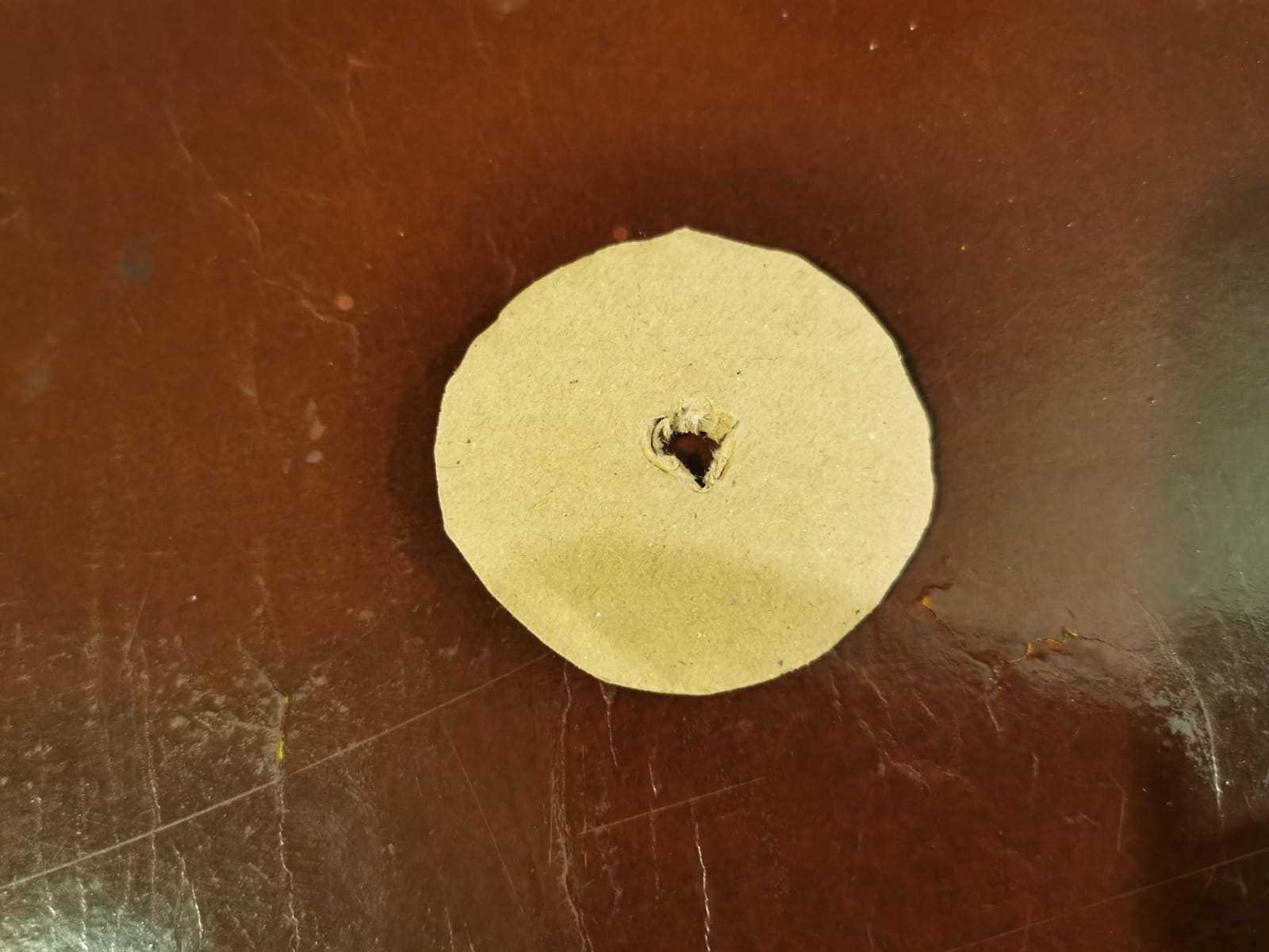 3.) Anschließend schneidet Ihr einen Kreis aus Pappe aus, der auf den Boden des Blumentopfes passt. Dieser soll das Bodenloch abdichten. Jetzt wird es etwas kniffelig, denn in die Mitte des Pappkreises schneidet Ihr nochmal ein kleines Loch, sodass Ihr den Ast durchführen könnt.