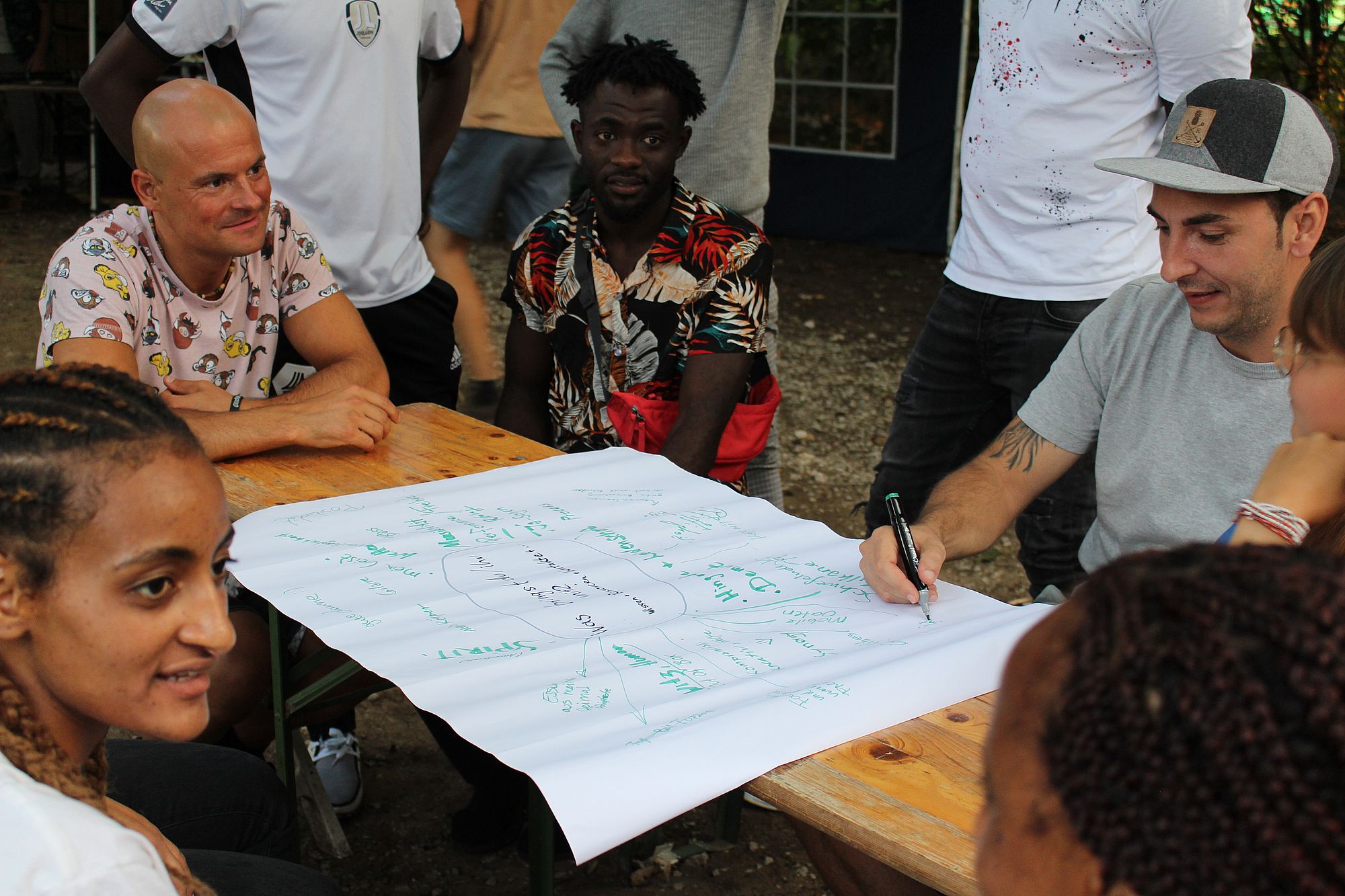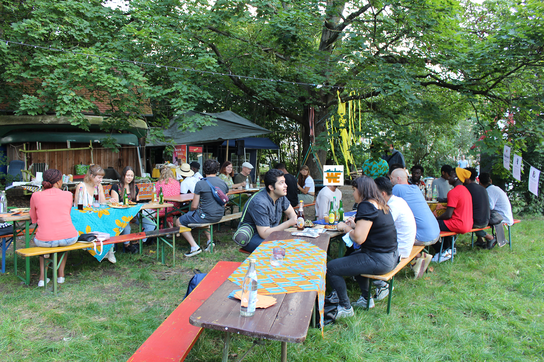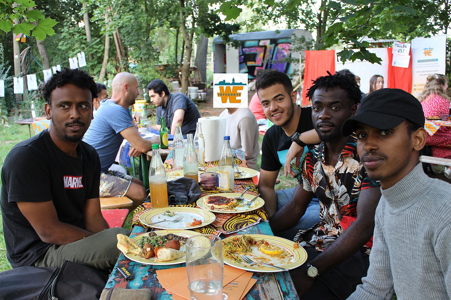 Um diesen Ehrenamtlichen für ihr Engagement zu danken, hatte der Verein sich etwas Besonderes ausgedacht: Ein Get-together mit Musik und guten arabischen Speisen von einem Cateringservice, mit dem sich zwei Migrantinnen selbständig gemacht haben. Priscilla Hirschhausen berichtet, dass die Ehrenamtlichen heute noch von diesem Fest im KollektivJardin in Muggenhof, hinter dem Naturfreundehaus, schwärmen.