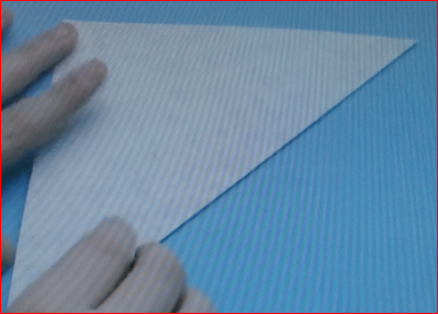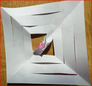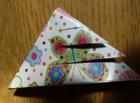 Das quadratische Papier 2 x diagonal falten und 3 x bis über die Mitte einschneiden.