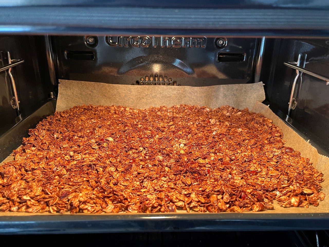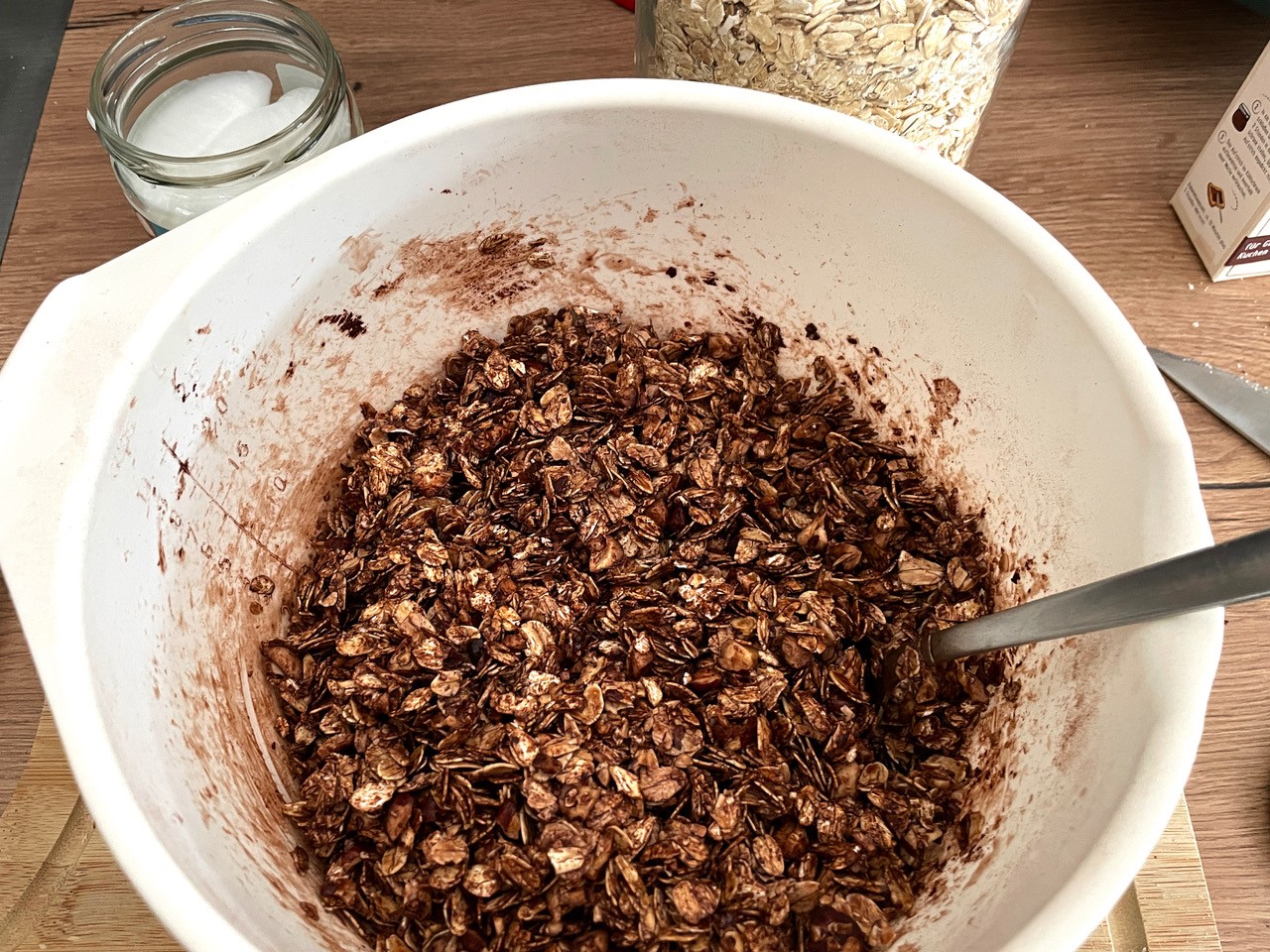 Flüssiges Kokosöl mit den Haferflocken, Nüssen, Kakao und Salz vermengen, auf ein mit Backpapier ausgelegtes Backblech verteilen und bei 140 Grad Umluft ca. 45 Minuten backen.